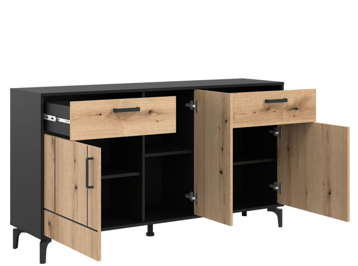 Úložný priestor je navrhnutý tak, aby bol prehľadný a využiteľný v domácnostiach. Komoda má 3 dvierka a dve zásuvky s plnovýsuvom, takže do uzatvorených častí môžete uložiť napríklad oblečenie, spoločenské hry, dokumenty či zásobu drobností.
