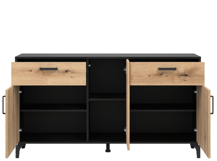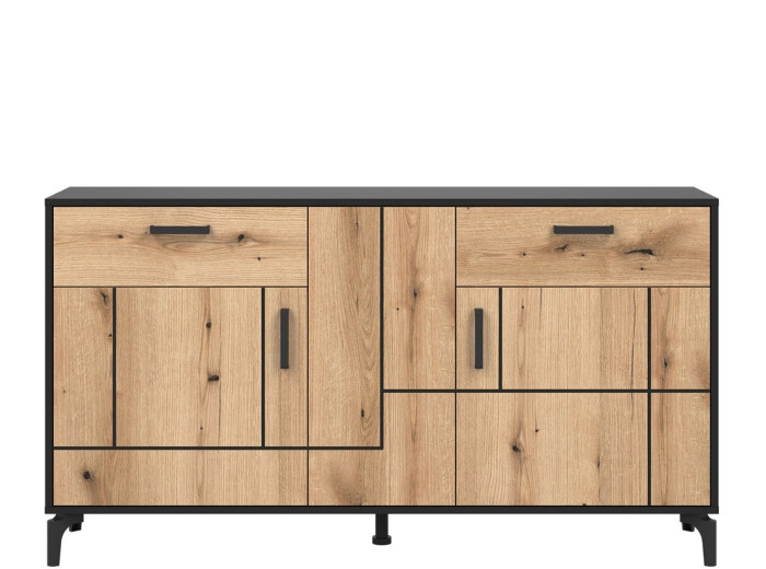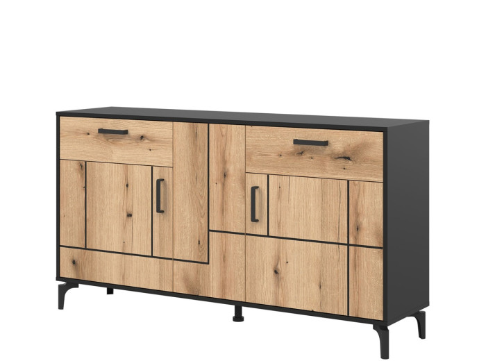 Komoda v šírke 153 cm je praktickým riešením pre obývacie steny a je súčasťou sektorového nábytku S-Line. Vyrobená je z laminovanej drevotriesky v hrúbke 16 mm s ABS hranami, predné plochy sú z MDF materiálu zdobené čiernymi pásmi. Farebné prevedenie je čierna matná + dub evoke. Celok dopĺňajú 12 cm vysoké nožičky, ktoré komodu opticky odľahčia a zároveň uľahčia upratovanie pod nábytkom.