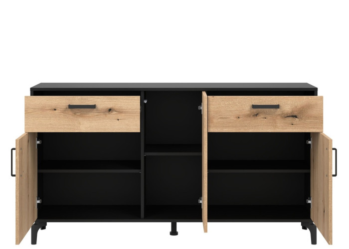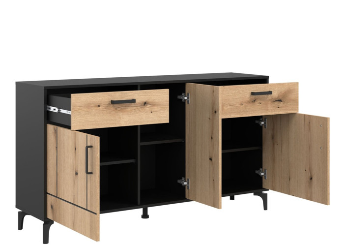 Úložný priestor je navrhnutý tak, aby bol prehľadný a využiteľný v domácnostiach. Komoda má 3 dvierka a dve zásuvky s plnovýsuvom, takže do uzatvorených častí môžete uložiť napríklad oblečenie, spoločenské hry, dokumenty či zásobu drobností.