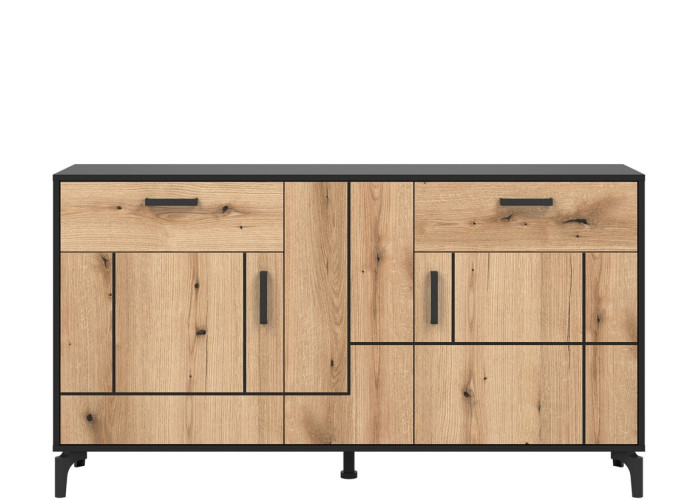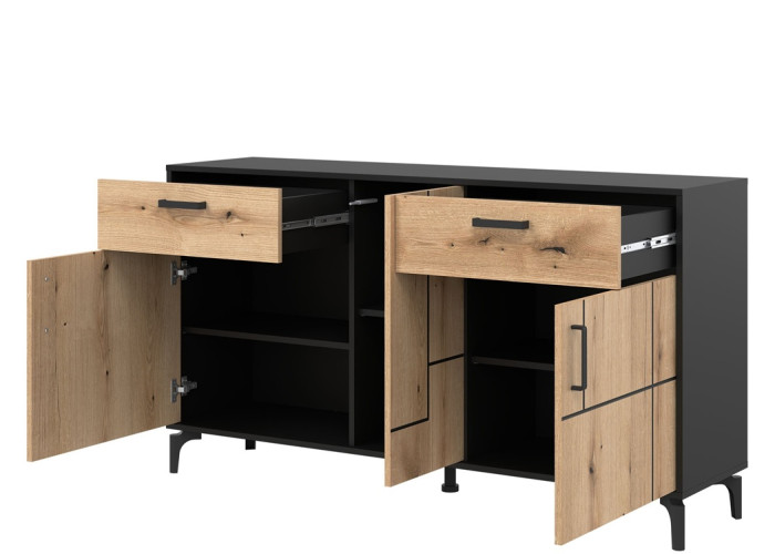 Komoda v šírke 153 cm je praktickým riešením pre obývacie steny a je súčasťou sektorového nábytku S-Line. Vyrobená je z laminovanej drevotriesky v hrúbke 16 mm s ABS hranami, predné plochy sú z MDF materiálu zdobené čiernymi pásmi. Farebné prevedenie je čierna matná + dub evoke. Celok dopĺňajú 12 cm vysoké nožičky, ktoré komodu opticky odľahčia a zároveň uľahčia upratovanie pod nábytkom.