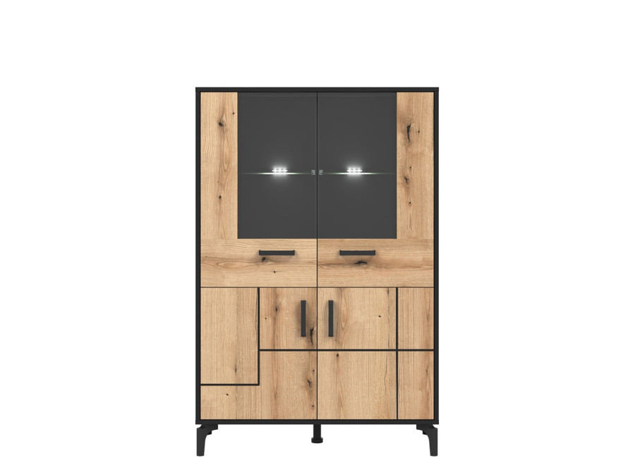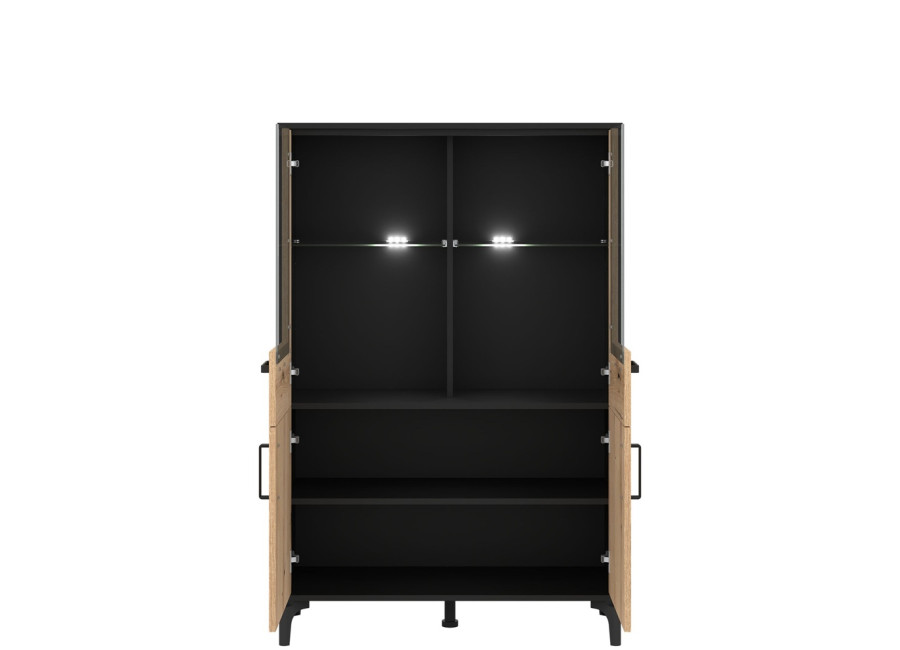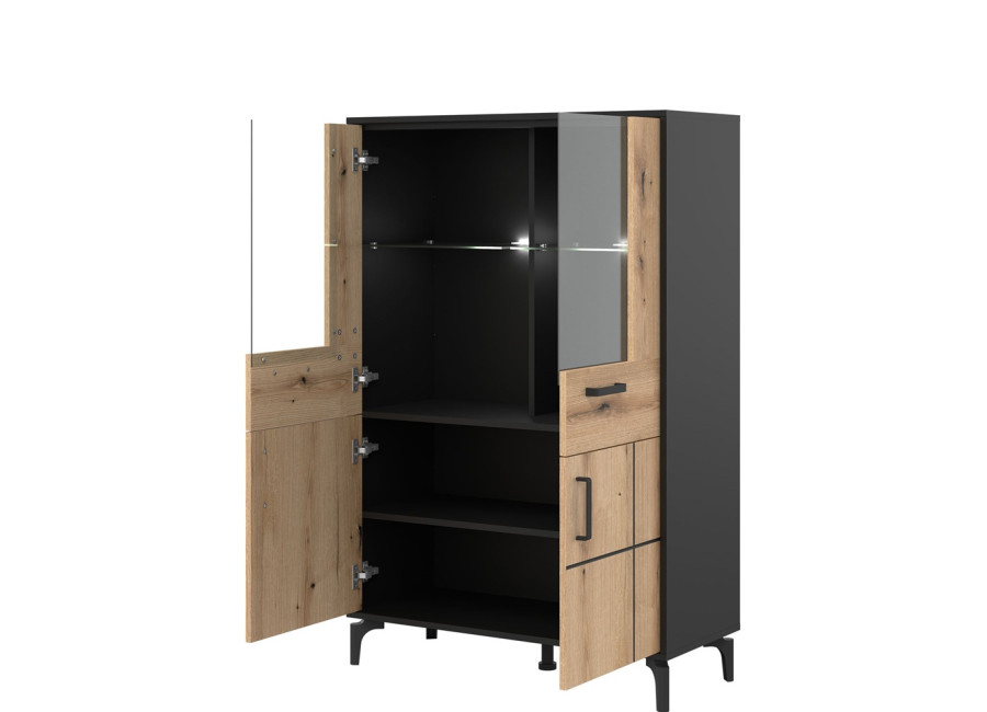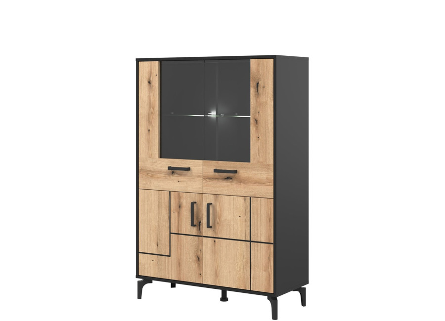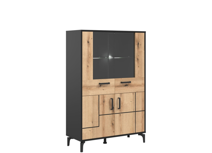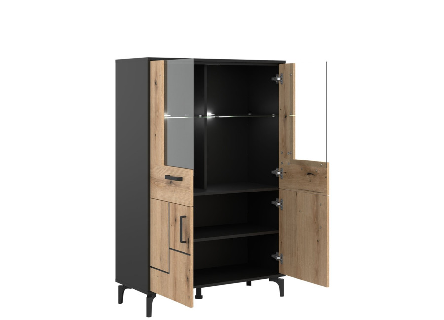 Vitrína v šírke 91,5 cm je súčasťou kolekcie sektorového nábytku S-Line. Farebné prevedenie je čierna matná + dub evoke, vhodný do moderných aj industriálne ladených interiérov. Vyrobená je z laminovanej drevotriesky v hrúbke 16 mm v čiernej farbe s ABS hranami, predné plochy sú z MDF materiálu vo farbe dub evoke s ozdobnými čiernymi pásmi. Stabilitu a moderný vzhľad zabezpečujú 12 cm vysoké nožičky. Vitrína má štyri dvierka, pričom vrchné sú presklené. Sklenená časť je ideálna na poháre, porcelán, dekorácie alebo dizajnové doplnky, ktoré dotvárajú atmosféru obývačky. Spodné uzatvorené časti poslúžia na dokumenty, textil či spoločenské hry.