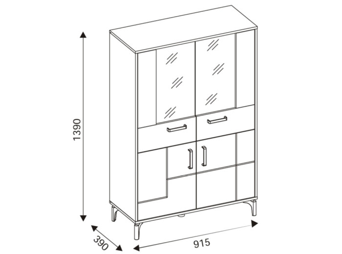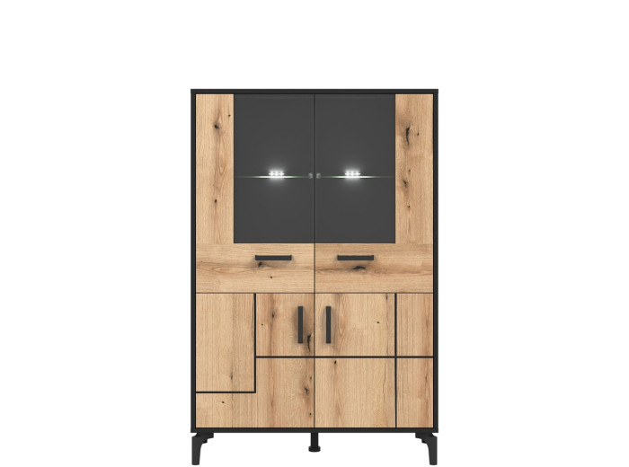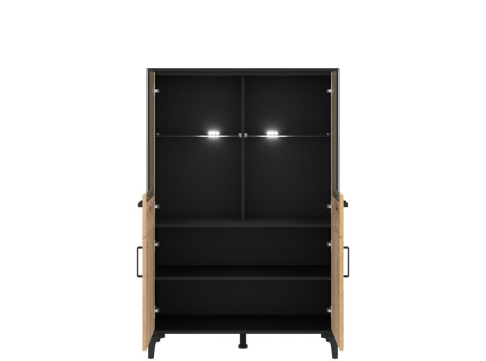 Vitrína v šírke 91,5 cm je súčasťou kolekcie sektorového nábytku S-Line. Farebné prevedenie je čierna matná + dub evoke, vhodný do moderných aj industriálne ladených interiérov. Vyrobená je z laminovanej drevotriesky v hrúbke 16 mm v čiernej farbe s ABS hranami, predné plochy sú z MDF materiálu vo farbe dub evoke s ozdobnými čiernymi pásmi. Stabilitu a moderný vzhľad zabezpečujú 12 cm vysoké nožičky. Vitrína má štyri dvierka, pričom vrchné sú presklené. Sklenená časť je ideálna na poháre, porcelán, dekorácie alebo dizajnové doplnky, ktoré dotvárajú atmosféru obývačky. Spodné uzatvorené časti poslúžia na dokumenty, textil či spoločenské hry.
