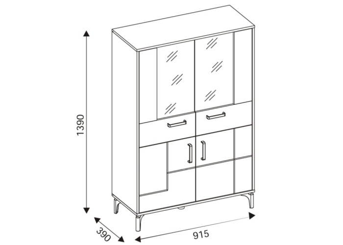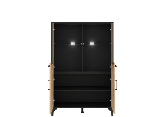 Vitrína v šírke 91,5 cm je súčasťou kolekcie sektorového nábytku S-Line. Farebné prevedenie je čierna matná + dub evoke, vhodný do moderných aj industriálne ladených interiérov. Vyrobená je z laminovanej drevotriesky v hrúbke 16 mm v čiernej farbe s ABS hranami, predné plochy sú z MDF materiálu vo farbe dub evoke s ozdobnými čiernymi pásmi. Stabilitu a moderný vzhľad zabezpečujú 12 cm vysoké nožičky. Vitrína má štyri dvierka, pričom vrchné sú presklené. Sklenená časť je ideálna na poháre, porcelán, dekorácie alebo dizajnové doplnky, ktoré dotvárajú atmosféru obývačky. Spodné uzatvorené časti poslúžia na dokumenty, textil či spoločenské hry.