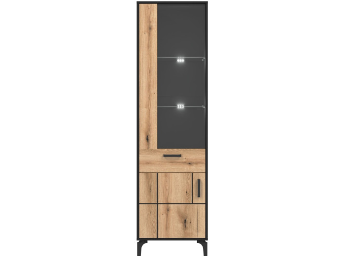 Vyrobená je z laminovanej drevotriesky v hrúbke 16 mm s ABS hranami v čiernej farbe, predné plochy sú z MDF materiálu vo farbe dub evoke s ozdobnými čiernymi pásmi. Vitrína má dvoje dvierka, vrchné sú presklené, čo Vám umožňuje kombinovať uzatvorený úložný priestor s miestom na vystavenie dekorácií. Presklená časť je ideálna na uloženie pohárov, porcelánu, kníh alebo dizajnových doplnkov. Spodná uzatvorená časť poslúži na veci, ktoré majú zostať skryté, ako sú dokumenty, drobný textil či spoločenské hry.