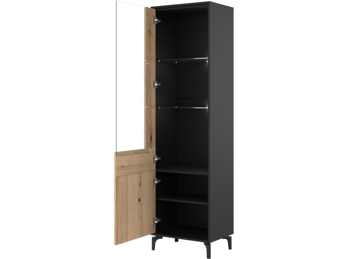 Vitrína v šírke 54,5 cm je praktickým riešením pre obývacie steny. Je súčasťou sektorového nábytku S-Line, vďaka čomu sa dá jednoducho kombinovať s ďalšími prvkami zostavy a prispôsobiť konkrétnemu dispozičnému riešeniu obývačky. Farebné prevedenie je čierna matná + dub evoke, ktoré pôsobí vyvážene a prirodzene zapadne do moderných aj mierne industriálnych interiérov. Celok dopĺňajú 12 cm vysoké nožičky, ktoré vitrínu opticky odľahčujú a zároveň uľahčujú údržbu podlahy.