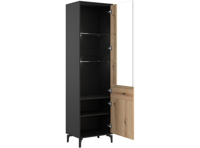 Vitrína v šírke 54,5 cm je praktickým riešením pre obývacie steny. Je súčasťou sektorového nábytku S-Line, vďaka čomu sa dá jednoducho kombinovať s ďalšími prvkami zostavy a prispôsobiť konkrétnemu dispozičnému riešeniu obývačky. Farebné prevedenie je čierna matná + dub evoke, ktoré pôsobí vyvážene a prirodzene zapadne do moderných aj mierne industriálnych interiérov. Celok dopĺňajú 12 cm vysoké nožičky, ktoré vitrínu opticky odľahčujú a zároveň uľahčujú údržbu podlahy.