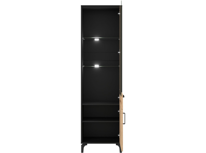 Vyrobená je z laminovanej drevotriesky v hrúbke 16 mm s ABS hranami v čiernej farbe, predné plochy sú z MDF materiálu vo farbe dub evoke s ozdobnými čiernymi pásmi. Vitrína má dvoje dvierka, vrchné sú presklené, čo Vám umožňuje kombinovať uzatvorený úložný priestor s miestom na vystavenie dekorácií. Presklená časť je ideálna na uloženie pohárov, porcelánu, kníh alebo dizajnových doplnkov. Spodná uzatvorená časť poslúži na veci, ktoré majú zostať skryté, ako sú dokumenty, drobný textil či spoločenské hry.