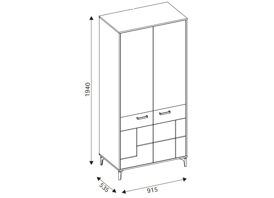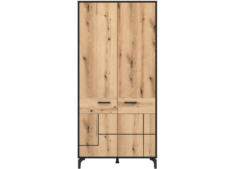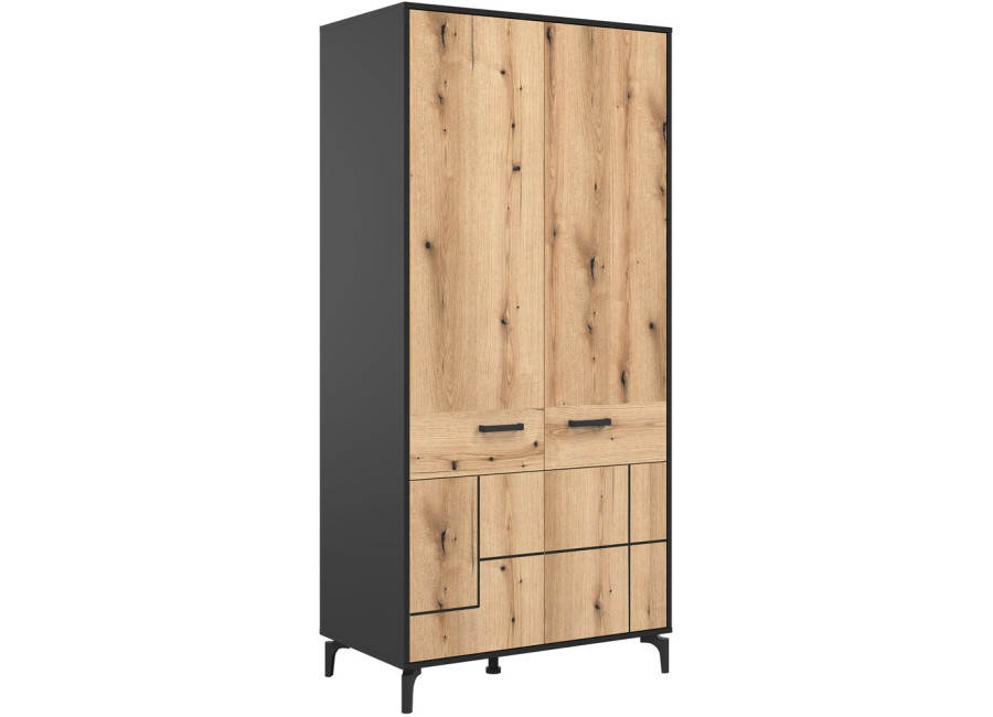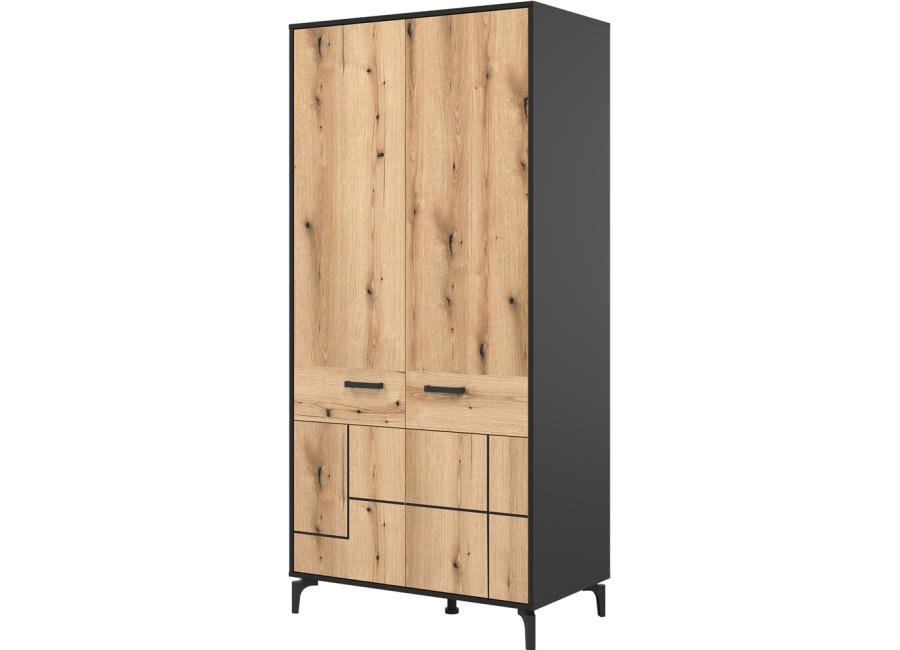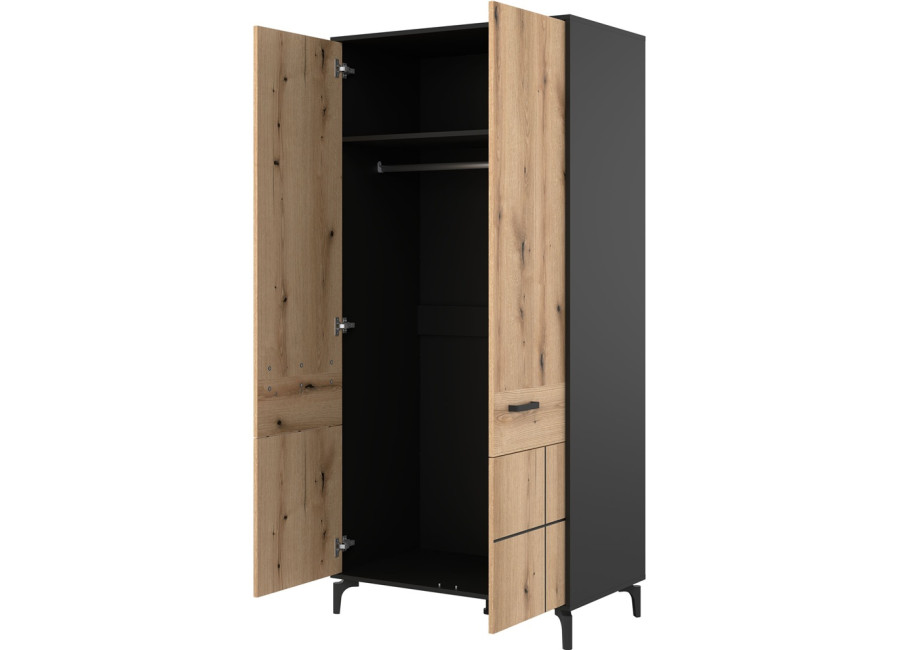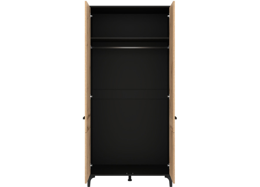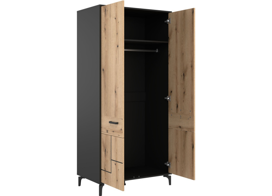 Šatníková skriňa v šírke 91,5 cm je navrhnutá ako univerzálny prvok, ktorý prirodzene zapadne do obývacích zostáv zložených zo sektorového nábytku S-Line, no rovnako dobre poslúži aj ako samostatná skriňa do chodby. Farebné prevedenie je čierna matná + dub evoke. Konštrukcia stojí na 12 cm vysokých nožičkách, ktoré skrini dodávajú vzdušnejší vzhľad a zároveň uľahčujú údržbu priestoru pod nábytkom. Vyrobená je z laminovanej drevotriesky v hrúbke 16 mm s ABS hranami, predné plochy sú z MDF materiálu, zdobené čiernym pásom, ktorý jemne zvýrazňuje čelá. Skriňa je dvojdverová, za ktorými sa nachádza praktický úložný priestor vhodný na uloženie oblečenia, kabátov alebo sezónnych doplnkov.