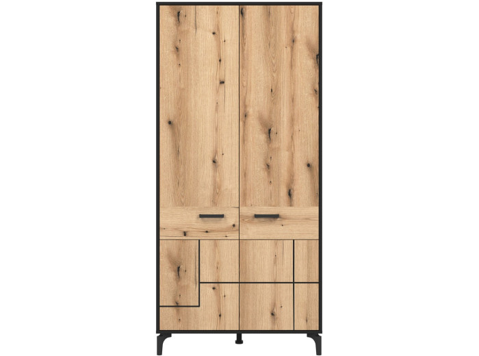 Šatníková skriňa v šírke 91,5 cm je navrhnutá ako univerzálny prvok, ktorý prirodzene zapadne do obývacích zostáv zložených zo sektorového nábytku S-Line, no rovnako dobre poslúži aj ako samostatná skriňa do chodby. Farebné prevedenie je čierna matná + dub evoke. Konštrukcia stojí na 12 cm vysokých nožičkách, ktoré skrini dodávajú vzdušnejší vzhľad a zároveň uľahčujú údržbu priestoru pod nábytkom. Vyrobená je z laminovanej drevotriesky v hrúbke 16 mm s ABS hranami, predné plochy sú z MDF materiálu, zdobené čiernym pásom, ktorý jemne zvýrazňuje čelá. Skriňa je dvojdverová, za ktorými sa nachádza praktický úložný priestor vhodný na uloženie oblečenia, kabátov alebo sezónnych doplnkov.