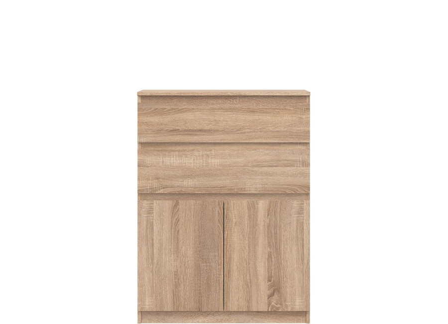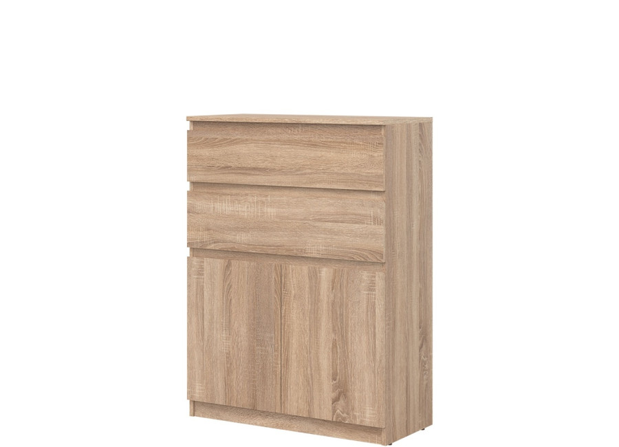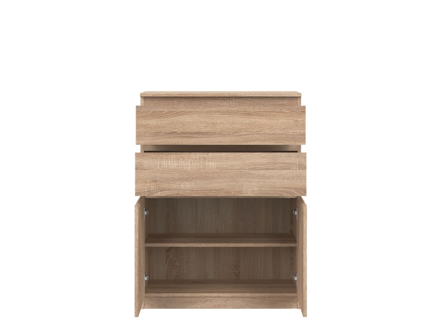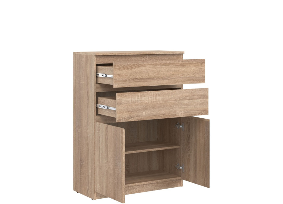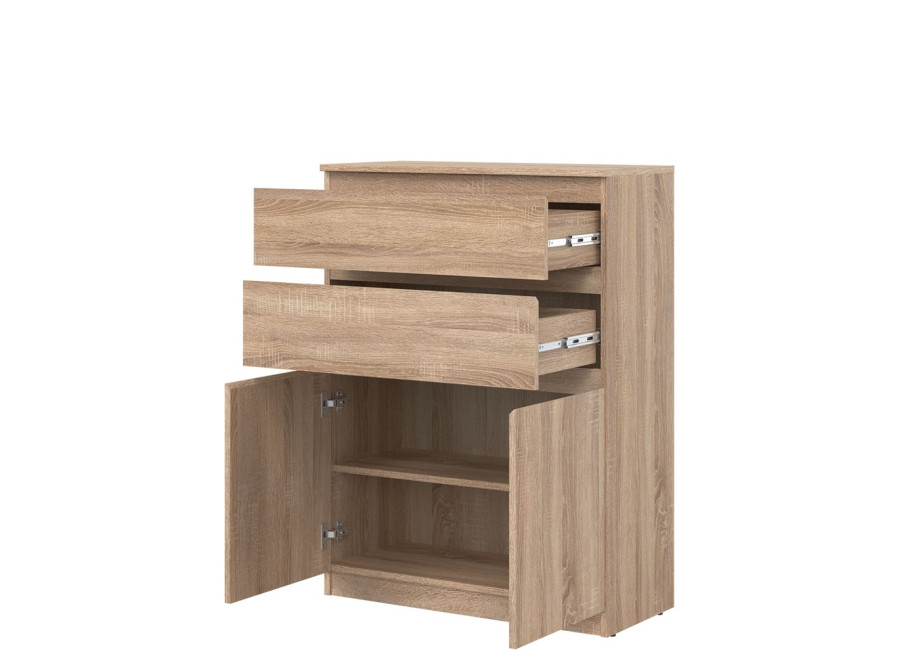 Vyrobená je z laminovanej drevotriesky v hrúbke 16 mm s ABS hranami. Farebné prevedenie je dub sonoma. Tradičné úchytky boli nahradené frézovanými prednými časťami. Úložný priestor tvoria dve zásuvky a dvoje dvierok, ktoré poskytujú miesto na uloženie dokumentov, textílií alebo drobných predmetov. Komoda je vhodná aj do detských izieb, kde poslúži na oblečenie či školské potreby.