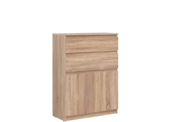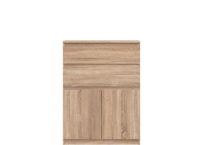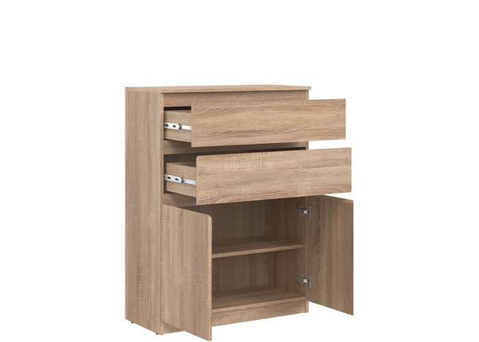 Vyrobená je z laminovanej drevotriesky v hrúbke 16 mm s ABS hranami. Farebné prevedenie je dub sonoma. Tradičné úchytky boli nahradené frézovanými prednými časťami. Úložný priestor tvoria dve zásuvky a dvoje dvierok, ktoré poskytujú miesto na uloženie dokumentov, textílií alebo drobných predmetov. Komoda je vhodná aj do detských izieb, kde poslúži na oblečenie či školské potreby.