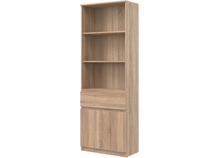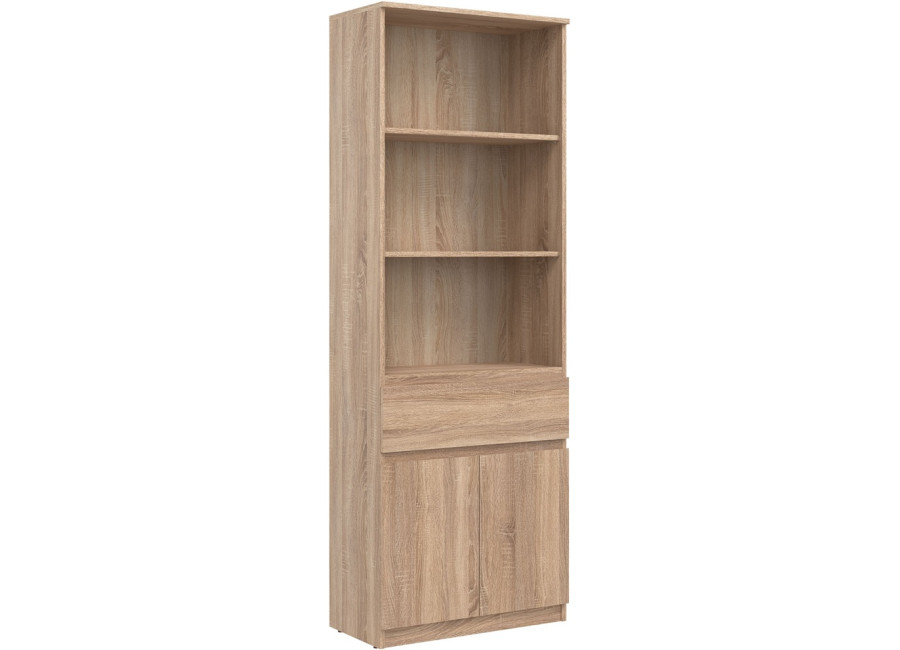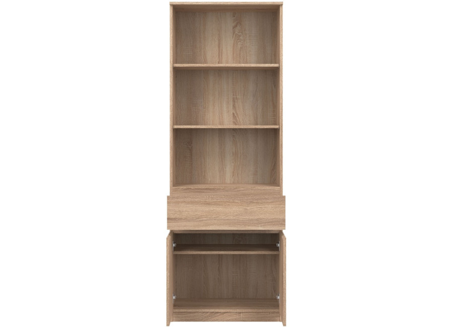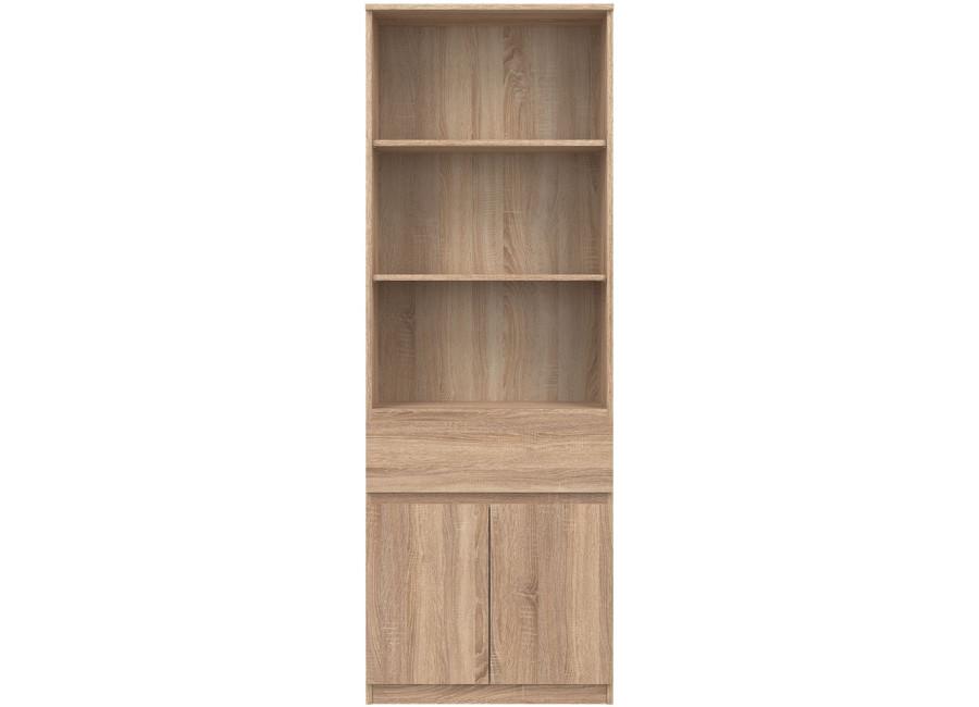 Policová skriňa REMI RM09 predstavuje praktický úložný prvok, ktorý sa uplatní v rôznych typoch interiérov. Ide o policovú skriňu resp. regál v šírke 68,5 cm, vďaka čomu je vhodná aj do menších miestností. Vyrobená je z laminovanej drevotriesky v hrúbke 16 mm s ABS hranami. Farebné prevedenie je dub sonoma. Tradičné úchytky boli nahradené frézovanými prednými časťami.