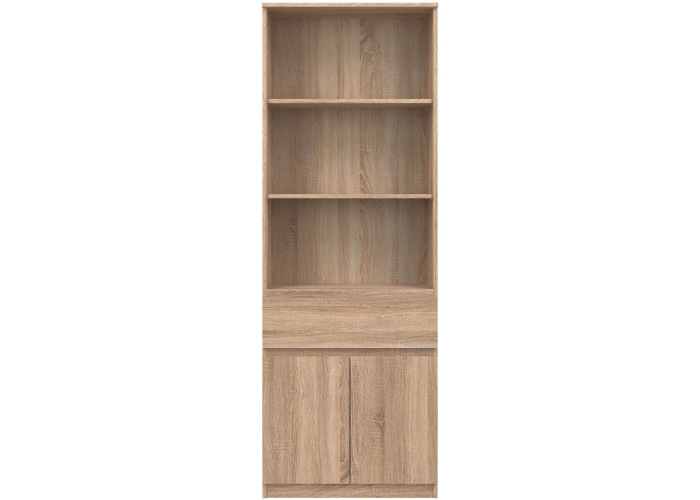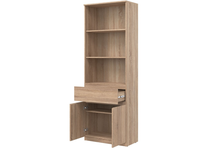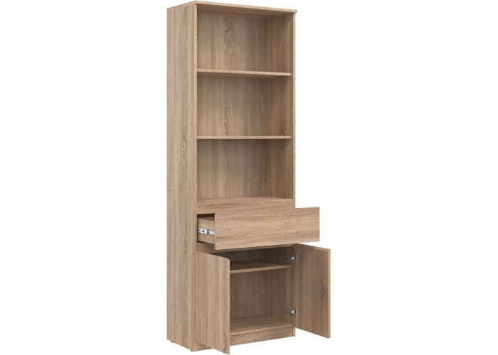 Policová skriňa REMI RM09 predstavuje praktický úložný prvok, ktorý sa uplatní v rôznych typoch interiérov. Ide o policovú skriňu resp. regál v šírke 68,5 cm, vďaka čomu je vhodná aj do menších miestností. Vyrobená je z laminovanej drevotriesky v hrúbke 16 mm s ABS hranami. Farebné prevedenie je dub sonoma. Tradičné úchytky boli nahradené frézovanými prednými časťami.