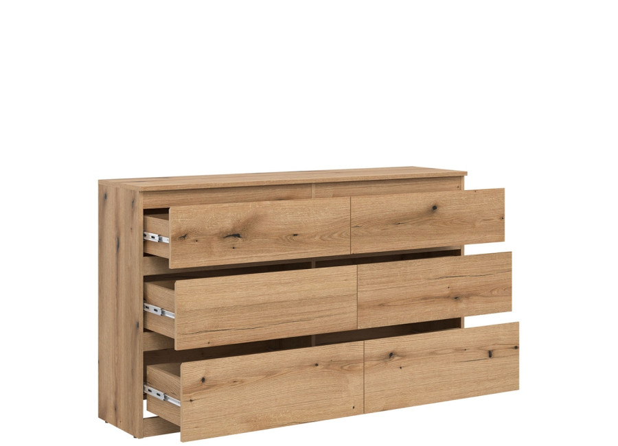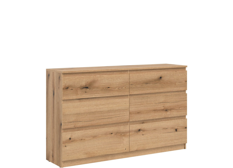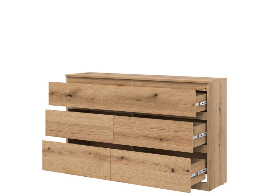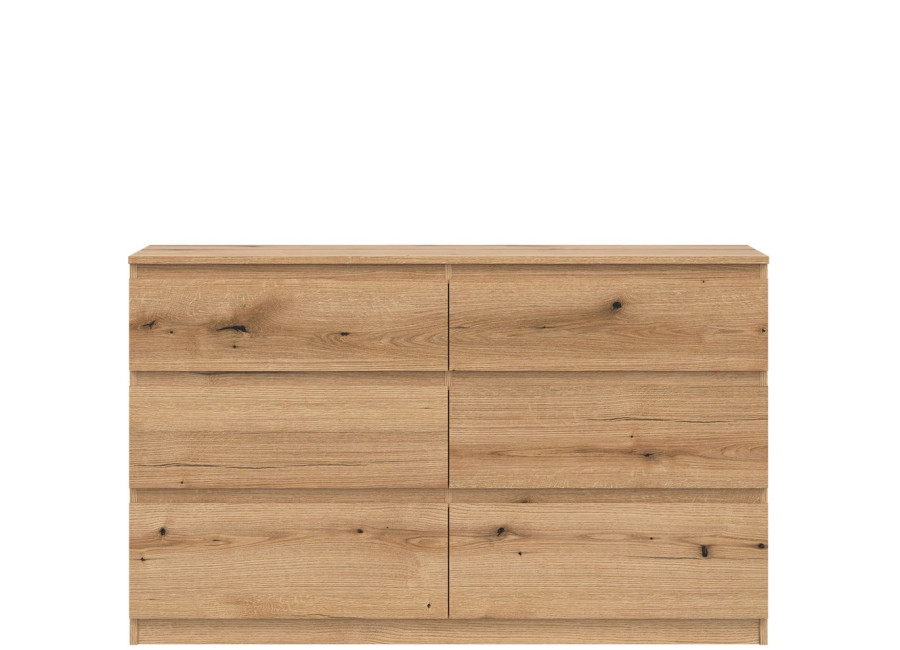 Komoda je vyrobená je z laminovanej drevotriesky v hrúbke 16 mm s ABS hranami. Farebné prevedenie je dub evoke. Tradičné úchytky boli nahradené frézovanými prednými časťami. Úložný priestor tvorí šesť zásuviek, ktoré umožňujú prehľadné rozdelenie uložených vecí. V obývačke môžu slúžiť na uskladnenie dokumentov, textílií alebo doplnkov. Komoda je vhodná aj do detskej izby, kde poskytne miesto na oblečenie či hračky.