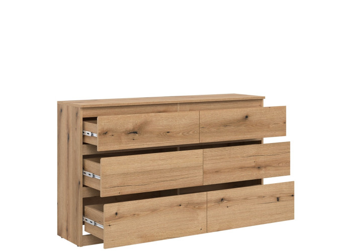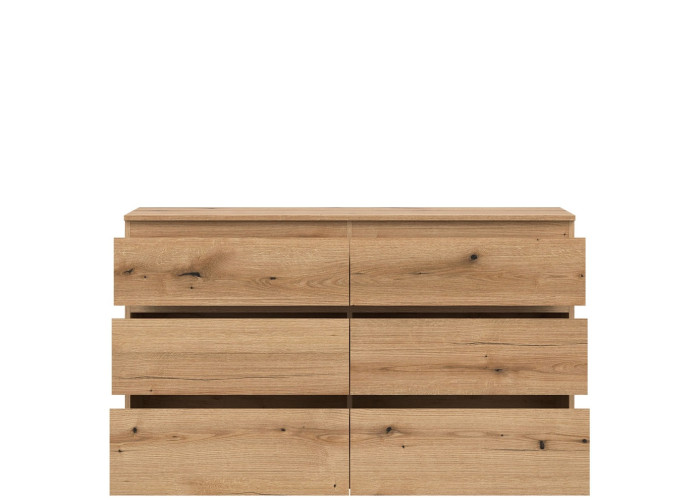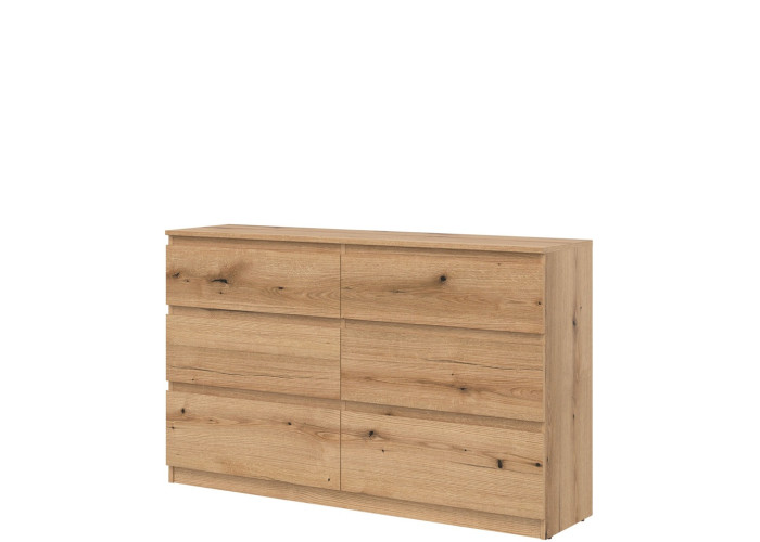 Komoda je vyrobená je z laminovanej drevotriesky v hrúbke 16 mm s ABS hranami. Farebné prevedenie je dub evoke. Tradičné úchytky boli nahradené frézovanými prednými časťami. Úložný priestor tvorí šesť zásuviek, ktoré umožňujú prehľadné rozdelenie uložených vecí. V obývačke môžu slúžiť na uskladnenie dokumentov, textílií alebo doplnkov. Komoda je vhodná aj do detskej izby, kde poskytne miesto na oblečenie či hračky.