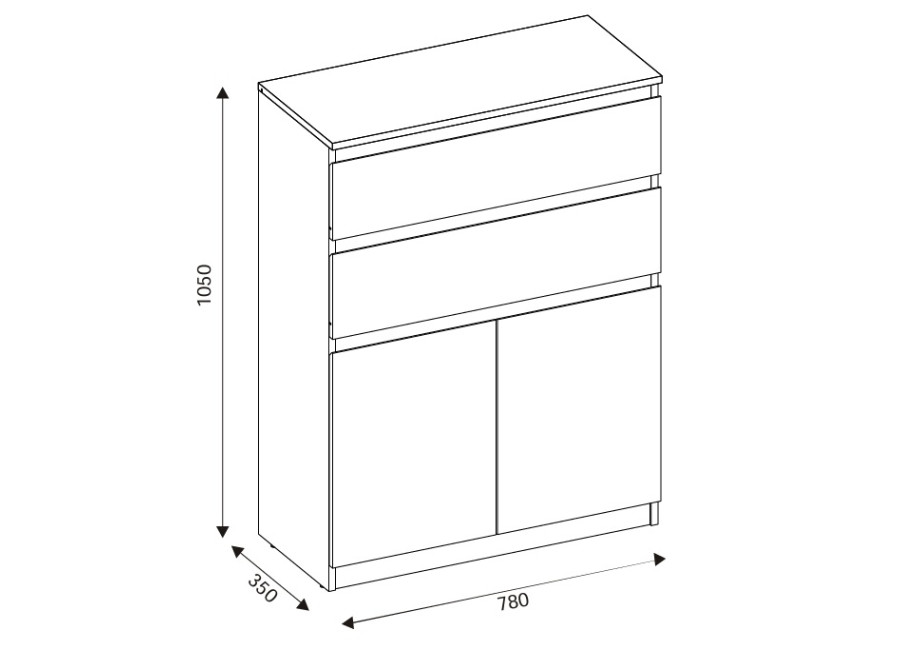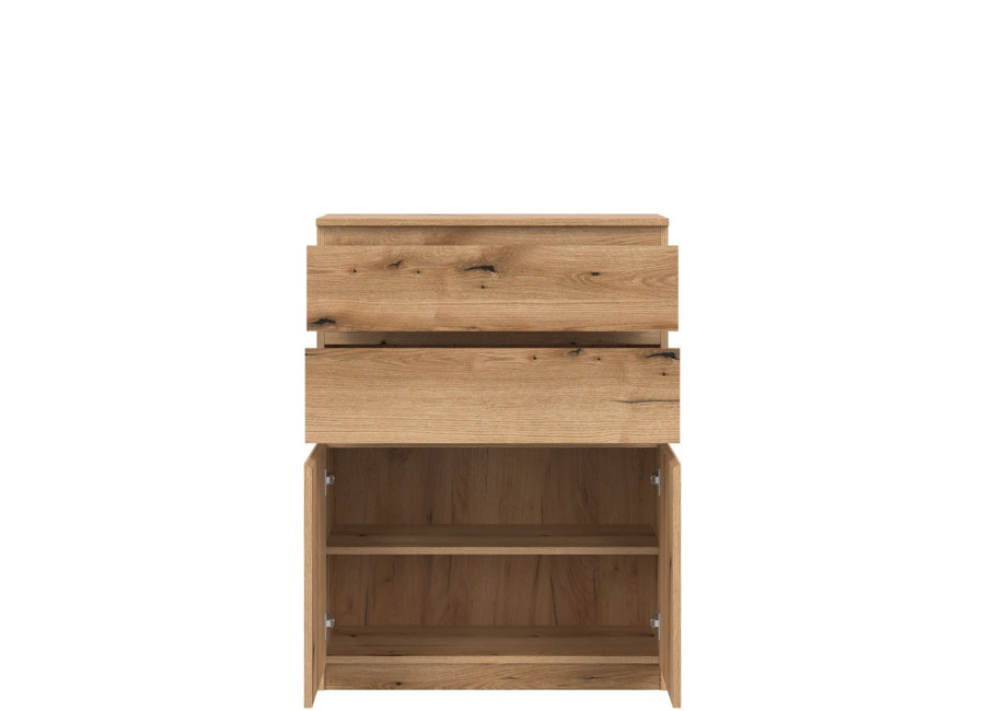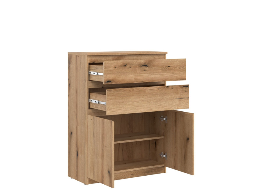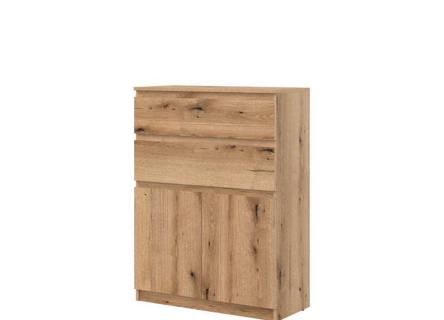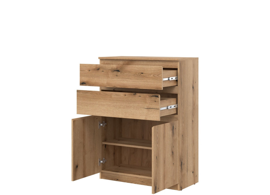 Vyrobená je z laminovanej drevotriesky v hrúbke 16 mm s ABS hranami. Farebné prevedenie je dub evoke. Tradičné úchytky boli nahradené frézovanými prednými časťami. Úložný priestor tvoria dve zásuvky a dvoje dvierok, ktoré poskytujú miesto na uloženie dokumentov, textílií alebo drobných predmetov. Komoda je vhodná aj do detských izieb, kde poslúži na oblečenie či školské potreby.