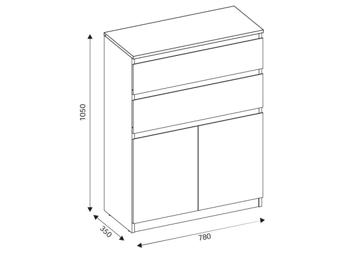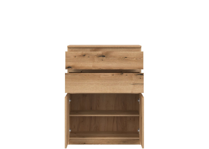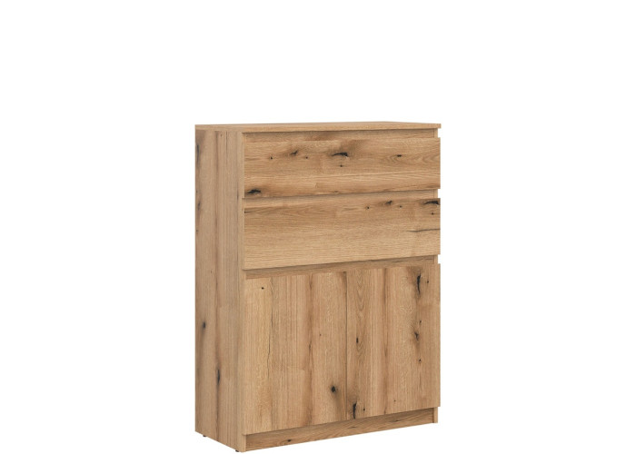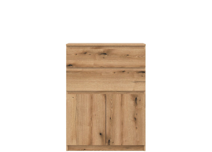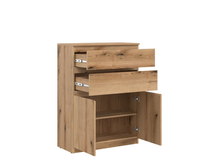 Vyrobená je z laminovanej drevotriesky v hrúbke 16 mm s ABS hranami. Farebné prevedenie je dub evoke. Tradičné úchytky boli nahradené frézovanými prednými časťami. Úložný priestor tvoria dve zásuvky a dvoje dvierok, ktoré poskytujú miesto na uloženie dokumentov, textílií alebo drobných predmetov. Komoda je vhodná aj do detských izieb, kde poslúži na oblečenie či školské potreby.