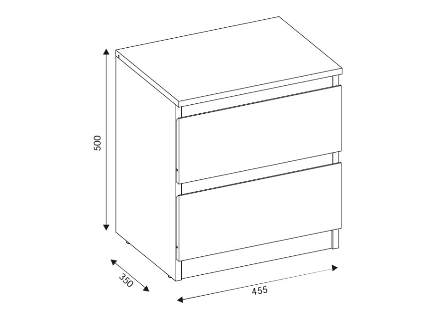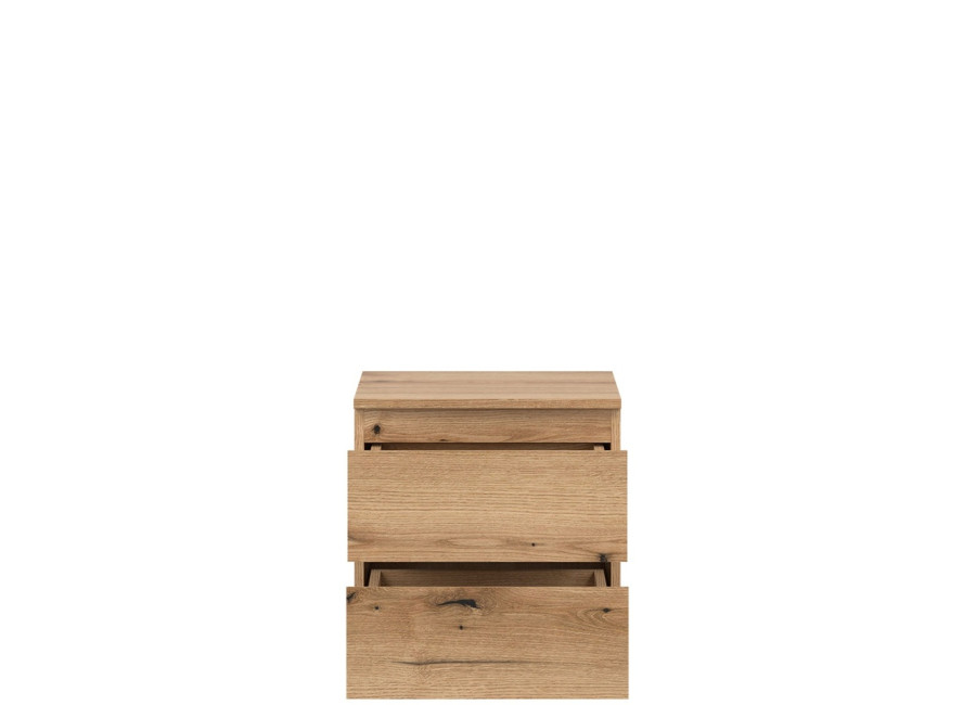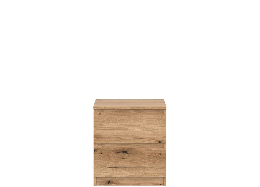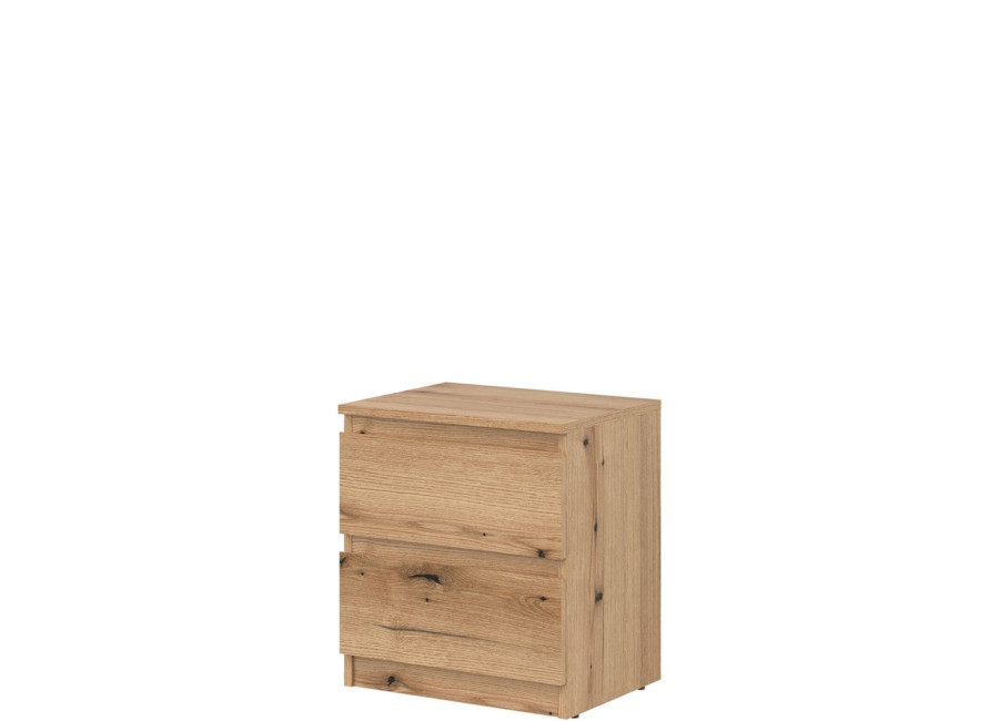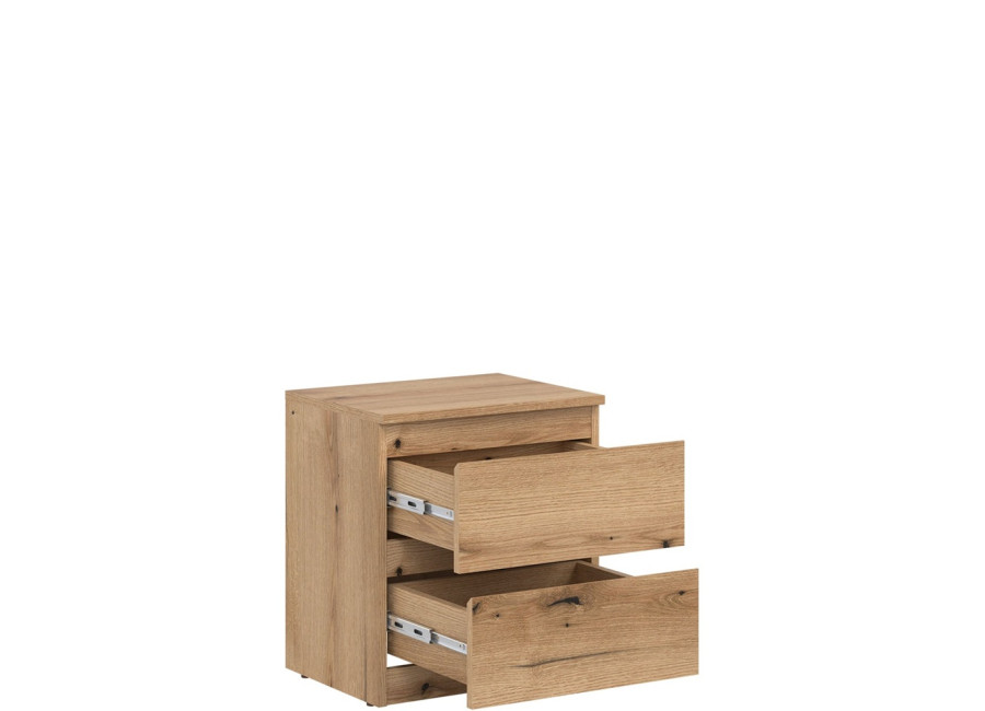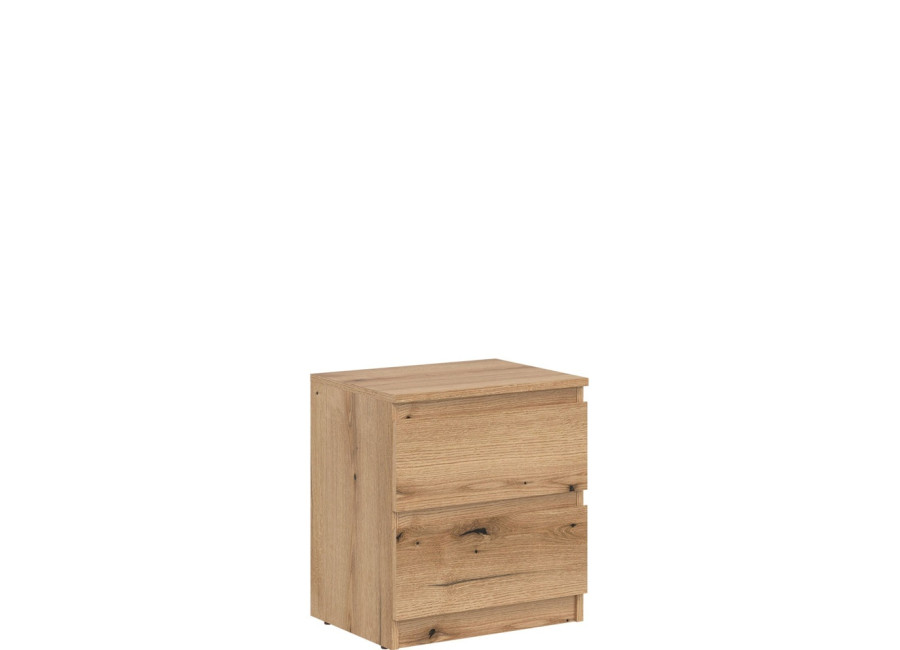 Nočný stolík REMI RM12 v šírke 45,5 cm ponúka dostatočnú odkladaciu plochu na lampu, budík alebo knihu. Svojím jednoduchým tvarom sa ľahko začlení do rôznych typov spální a doplní aj zostavy sektorového nábytku. Vyrobený je z laminovanej drevotriesky v hrúbke 16 mm s ABS hranami. Farebné prevedenie je dub evoke. Tradičné úchytky boli nahradené frézovanými prednými časťami. Úložný priestor tvoria dve zásuvky, vhodné na uloženie drobností, ako sú okuliare, nabíjačka, knihy alebo osobné predmety.
