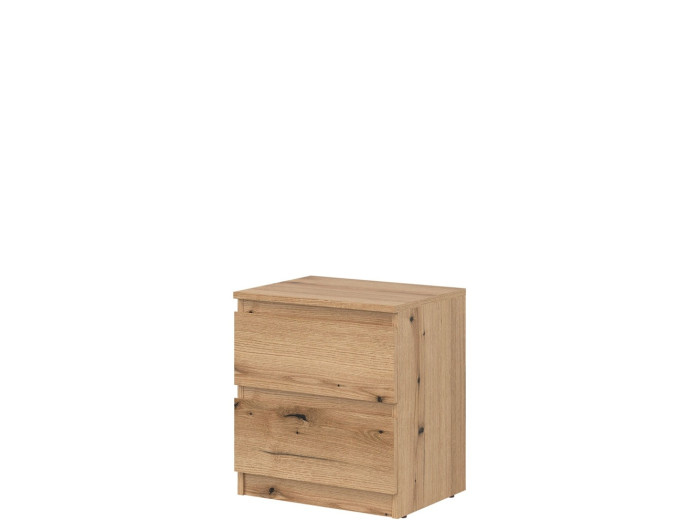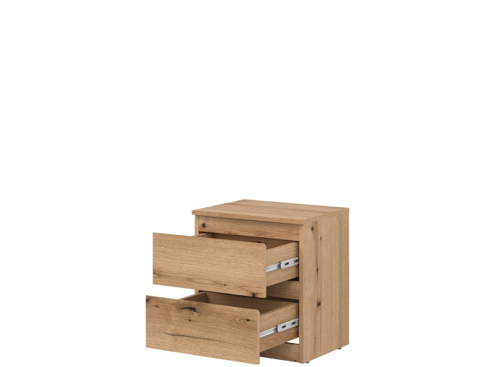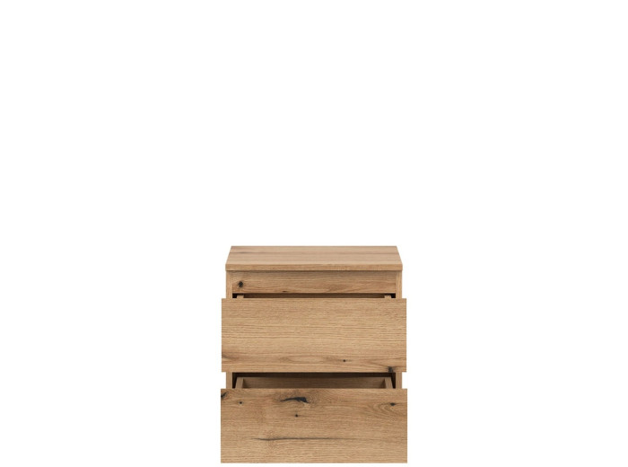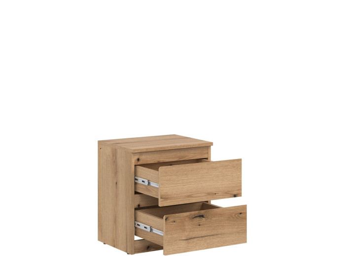 Nočný stolík REMI RM12 v šírke 45,5 cm ponúka dostatočnú odkladaciu plochu na lampu, budík alebo knihu. Svojím jednoduchým tvarom sa ľahko začlení do rôznych typov spální a doplní aj zostavy sektorového nábytku. Vyrobený je z laminovanej drevotriesky v hrúbke 16 mm s ABS hranami. Farebné prevedenie je dub evoke. Tradičné úchytky boli nahradené frézovanými prednými časťami. Úložný priestor tvoria dve zásuvky, vhodné na uloženie drobností, ako sú okuliare, nabíjačka, knihy alebo osobné predmety.
