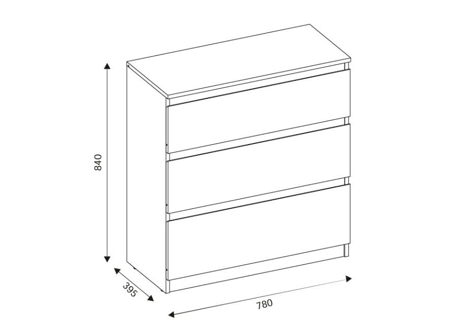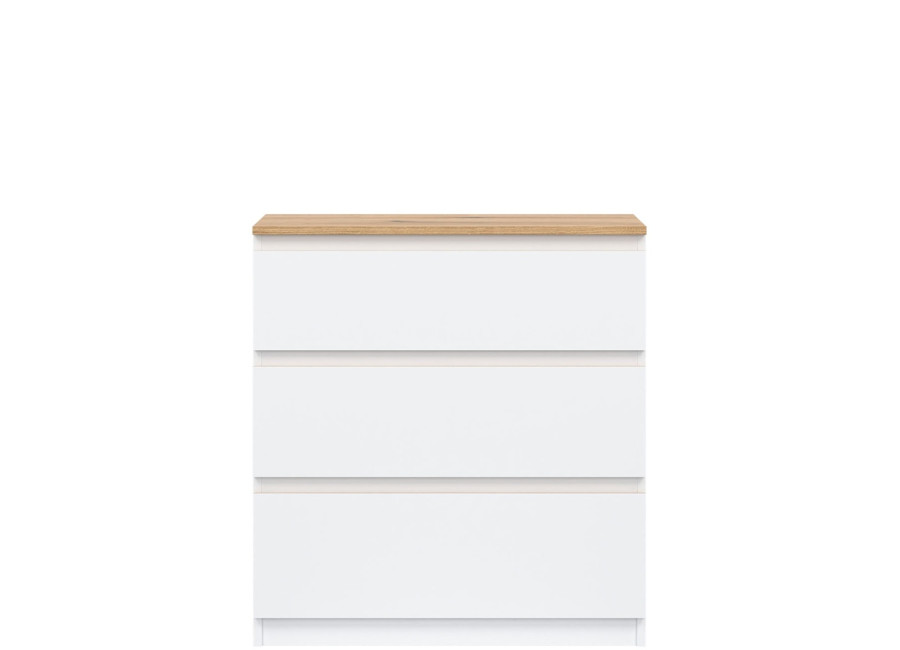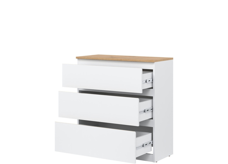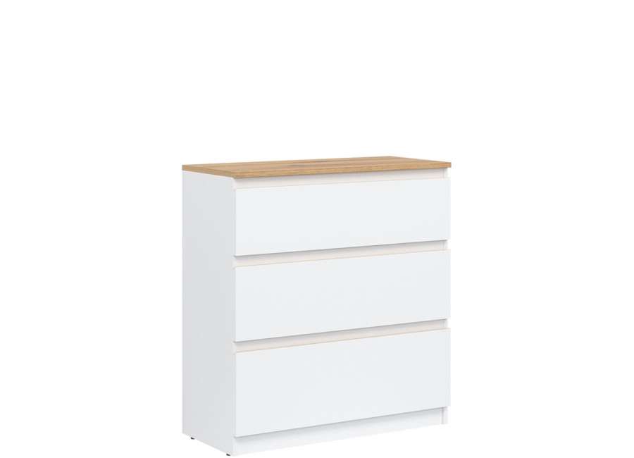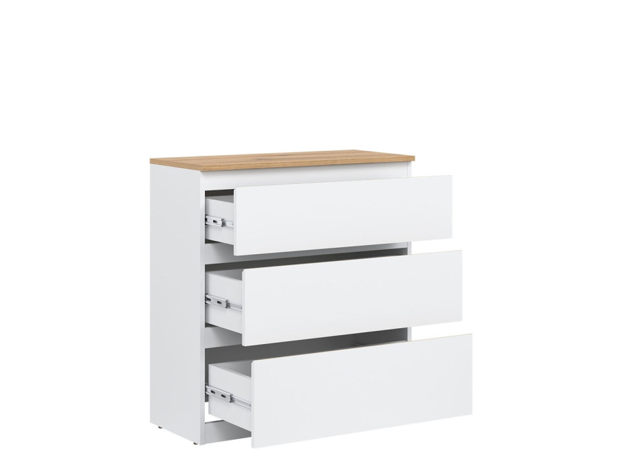 Komoda REMI RM02 je praktickým doplnkom do obývacej alebo detskej izby. Ide o komodu v šírke 78 cm, ktorá sa vďaka svojim rozmerom hodí aj do menších priestorov. Minimalistický a jednoduchý dizajn umožňuje jej ľahké zakomponovanie do rôznych štýlov zariadenia. Vyrobená je z laminovanej drevotriesky v hrúbke 16 mm s ABS hranami. Farebné prevedenie je biela + dub evoke. Tradičné úchytky boli nahradené frézovanými hranami vo farbe dub evoke. Úložný priestor tvoria tri zásuvky, ktoré ponúkajú dostatok miesta na uloženie dokumentov, textílií alebo ďalších vecí.