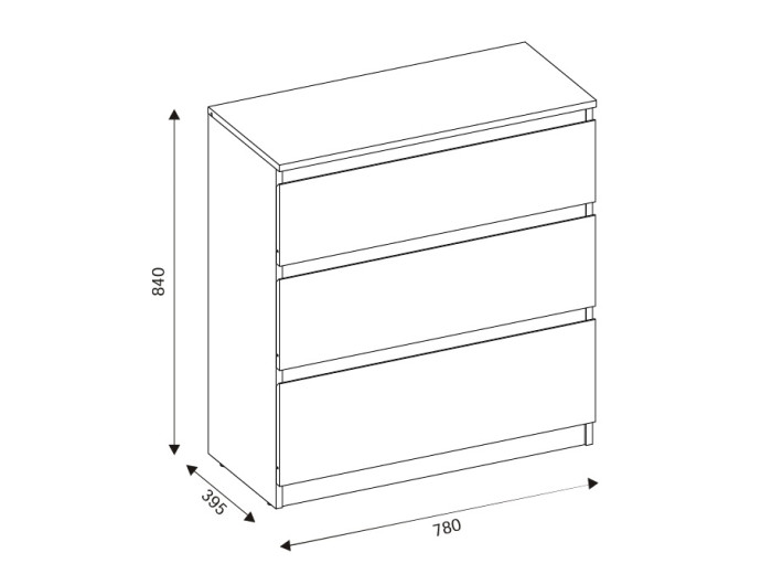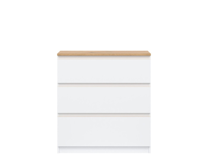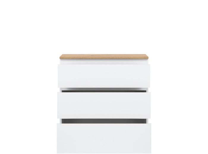 Komoda REMI RM02 je praktickým doplnkom do obývacej alebo detskej izby. Ide o komodu v šírke 78 cm, ktorá sa vďaka svojim rozmerom hodí aj do menších priestorov. Minimalistický a jednoduchý dizajn umožňuje jej ľahké zakomponovanie do rôznych štýlov zariadenia. Vyrobená je z laminovanej drevotriesky v hrúbke 16 mm s ABS hranami. Farebné prevedenie je biela + dub evoke. Tradičné úchytky boli nahradené frézovanými hranami vo farbe dub evoke. Úložný priestor tvoria tri zásuvky, ktoré ponúkajú dostatok miesta na uloženie dokumentov, textílií alebo ďalších vecí.
