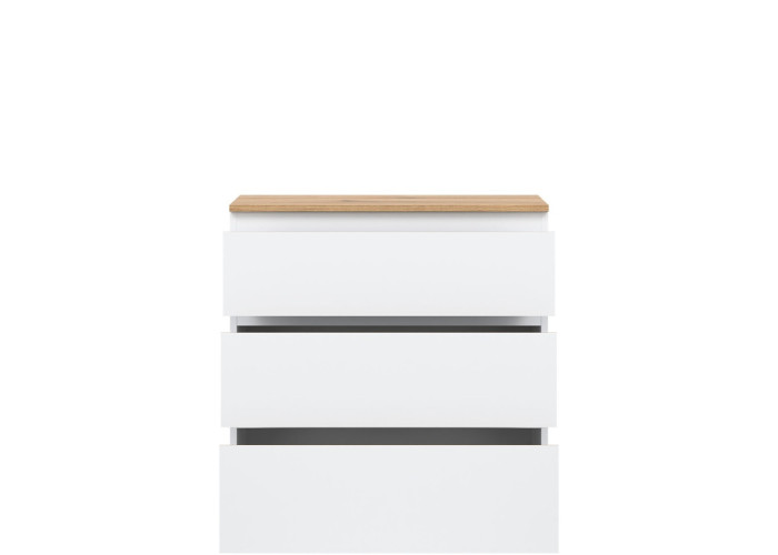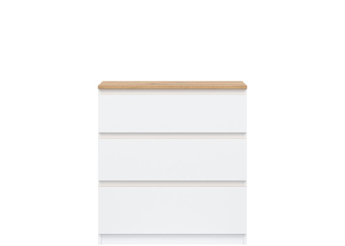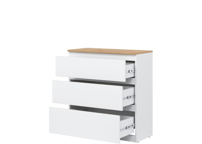Komoda REMI RM02 je praktickým doplnkom do obývacej alebo detskej izby. Ide o komodu v šírke 78 cm, ktorá sa vďaka svojim rozmerom hodí aj do menších priestorov. Minimalistický a jednoduchý dizajn umožňuje jej ľahké zakomponovanie do rôznych štýlov zariadenia. Vyrobená je z laminovanej drevotriesky v hrúbke 16 mm s ABS hranami. Farebné prevedenie je biela + dub evoke. Tradičné úchytky boli nahradené frézovanými hranami vo farbe dub evoke. Úložný priestor tvoria tri zásuvky, ktoré ponúkajú dostatok miesta na uloženie dokumentov, textílií alebo ďalších vecí.