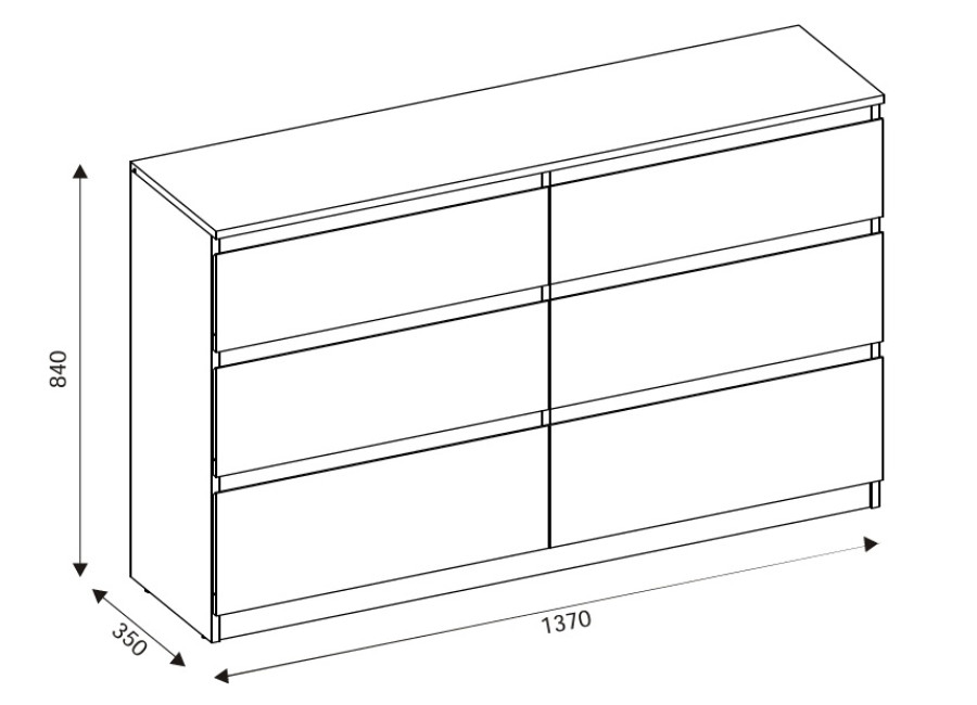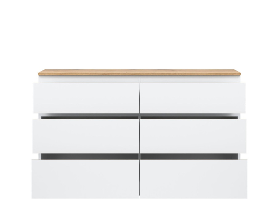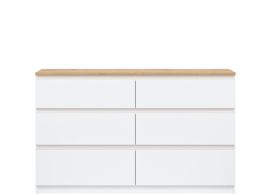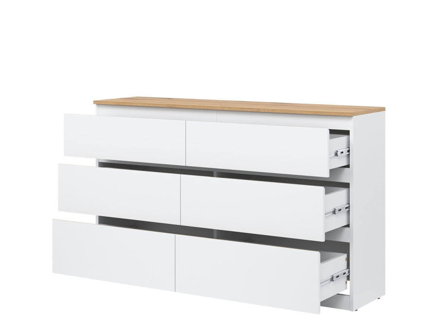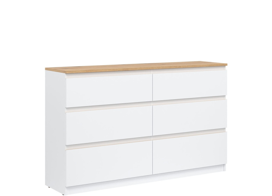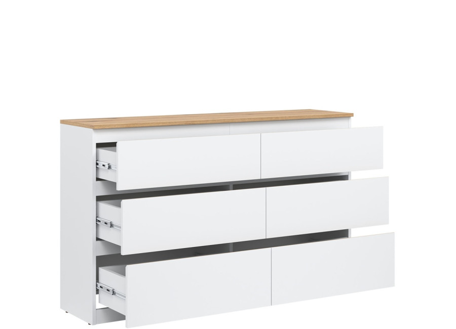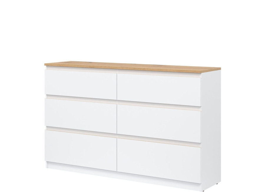 Komoda je vyrobená je z laminovanej drevotriesky v hrúbke 16 mm s ABS hranami. Farebné prevedenie je biela + dub evoke. Tradičné úchytky boli nahradené frézovanými hranami vo farbe dub. Úložný priestor tvorí šesť zásuviek, ktoré umožňujú prehľadné rozdelenie uložených vecí. V obývačke môžu slúžiť na uskladnenie dokumentov, textílií alebo doplnkov. Komoda je vhodná aj do detskej izby, kde poskytne miesto na oblečenie či hračky.
