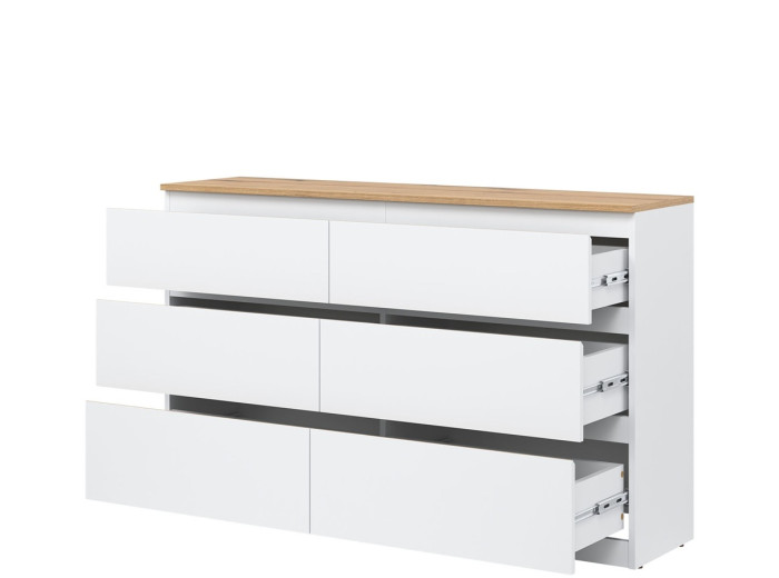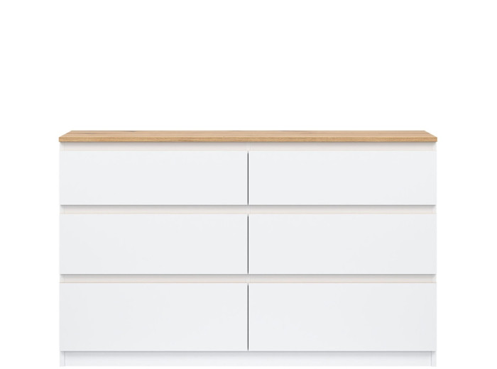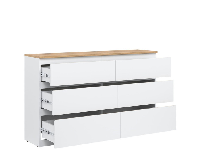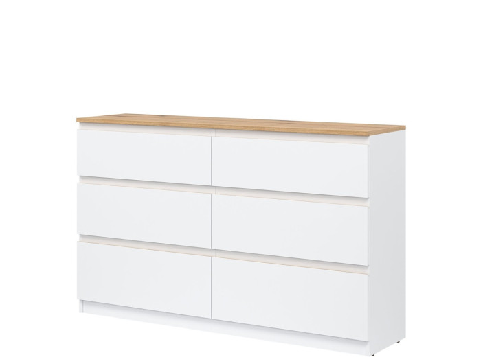 Komoda je vyrobená je z laminovanej drevotriesky v hrúbke 16 mm s ABS hranami. Farebné prevedenie je biela + dub evoke. Tradičné úchytky boli nahradené frézovanými hranami vo farbe dub. Úložný priestor tvorí šesť zásuviek, ktoré umožňujú prehľadné rozdelenie uložených vecí. V obývačke môžu slúžiť na uskladnenie dokumentov, textílií alebo doplnkov. Komoda je vhodná aj do detskej izby, kde poskytne miesto na oblečenie či hračky.