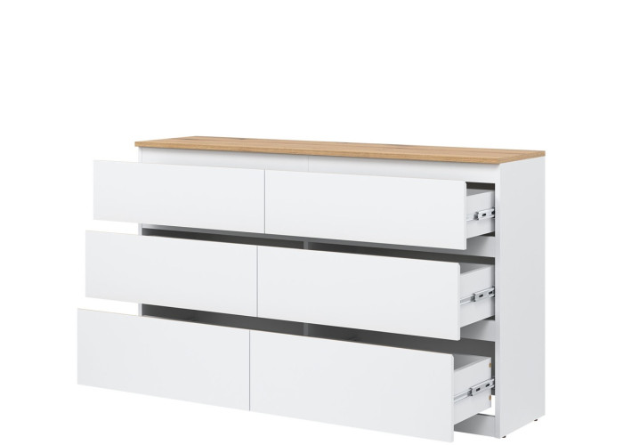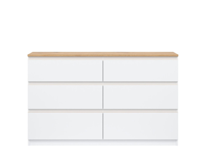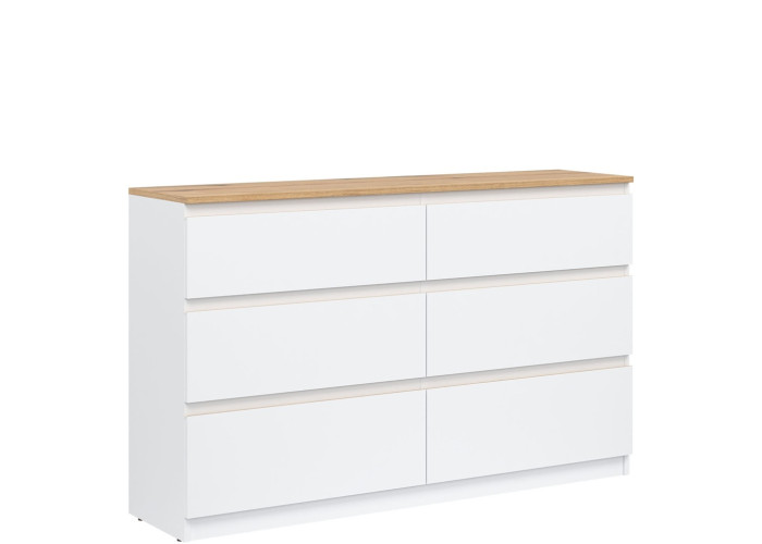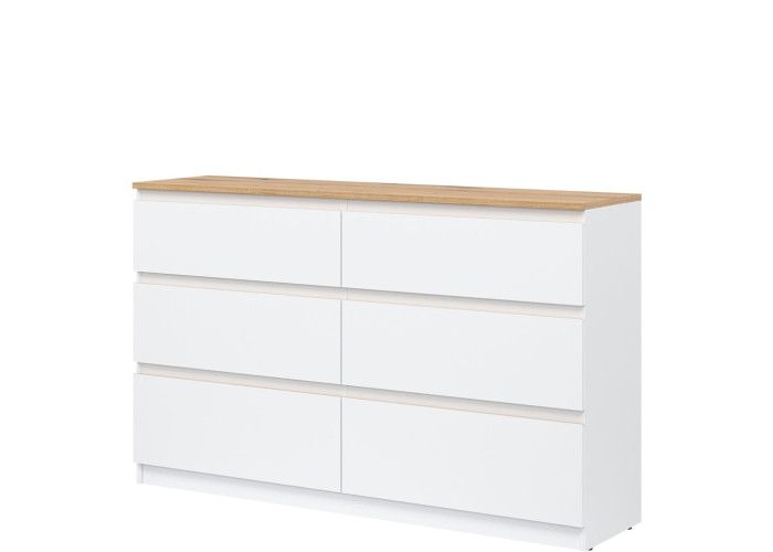 Komoda je vyrobená je z laminovanej drevotriesky v hrúbke 16 mm s ABS hranami. Farebné prevedenie je biela + dub evoke. Tradičné úchytky boli nahradené frézovanými hranami vo farbe dub. Úložný priestor tvorí šesť zásuviek, ktoré umožňujú prehľadné rozdelenie uložených vecí. V obývačke môžu slúžiť na uskladnenie dokumentov, textílií alebo doplnkov. Komoda je vhodná aj do detskej izby, kde poskytne miesto na oblečenie či hračky.