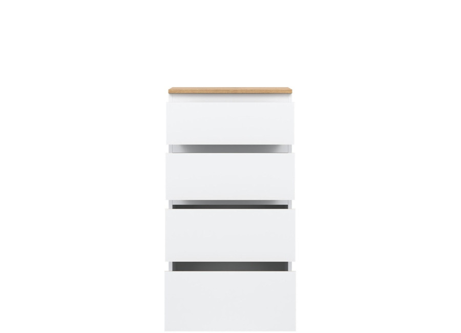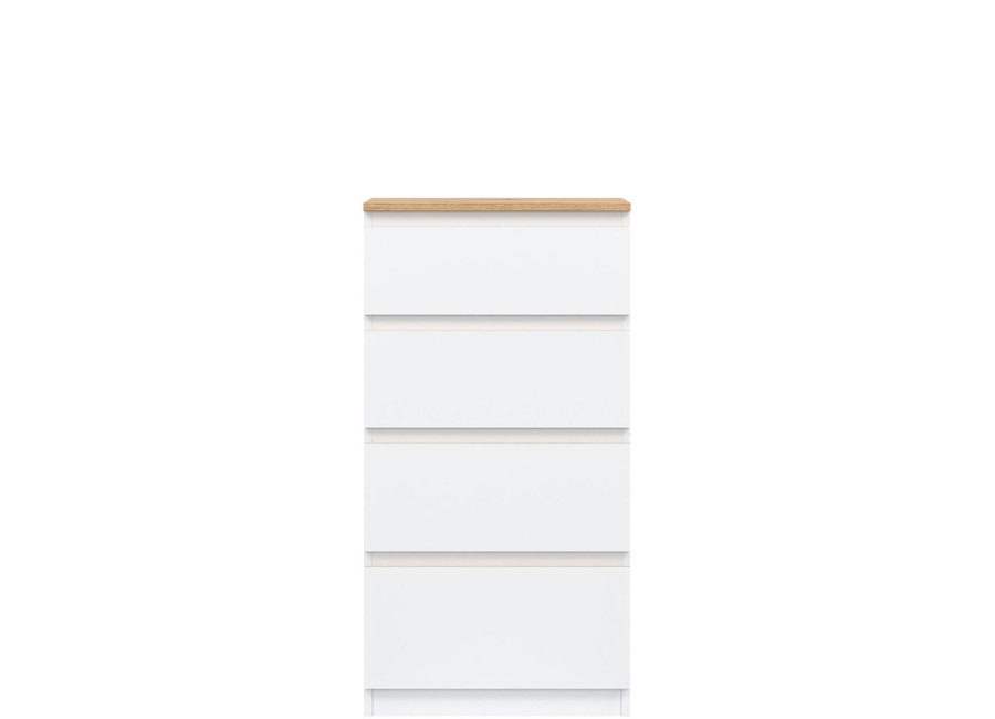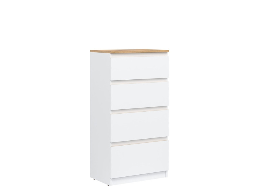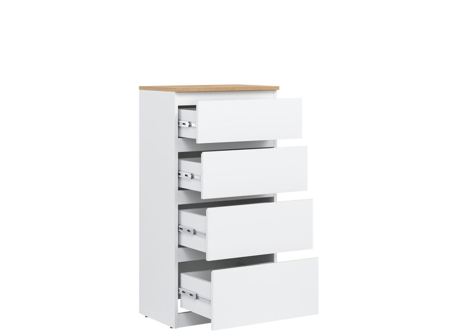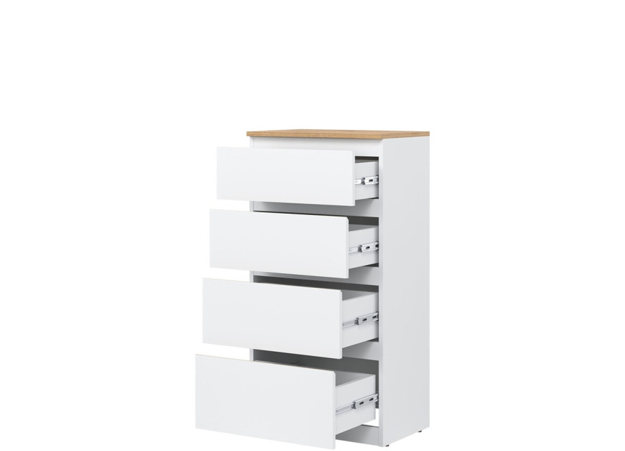 Vyrobená je z laminovanej drevotriesky v hrúbke 16 mm s ABS hranami. Farebné prevedenie je biela + dub evoke. Tradičné úchytky boli nahradené frézovanými hranami vo farbe dub evoke. Úložný priestor tvoria štyri zásuvky, vhodné na uloženie dokumentov, drobností, textílií či osobných vecí. Komoda sa osvedčí aj v detských izbách, kde poslúži na oblečenie alebo školské potreby.
