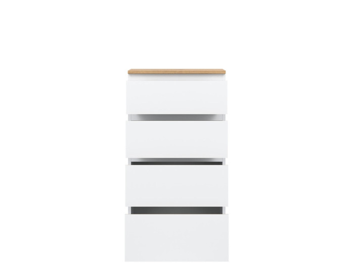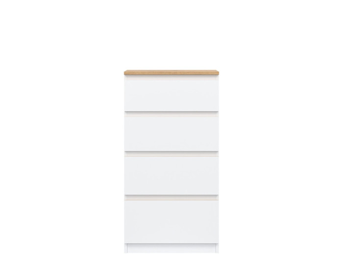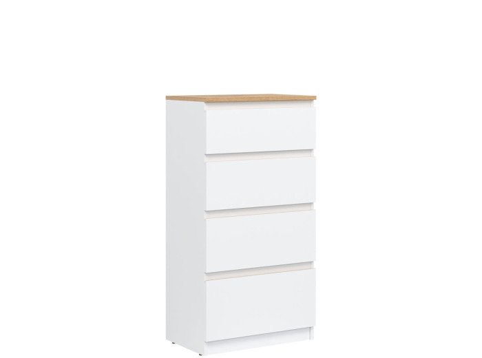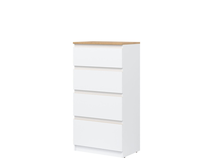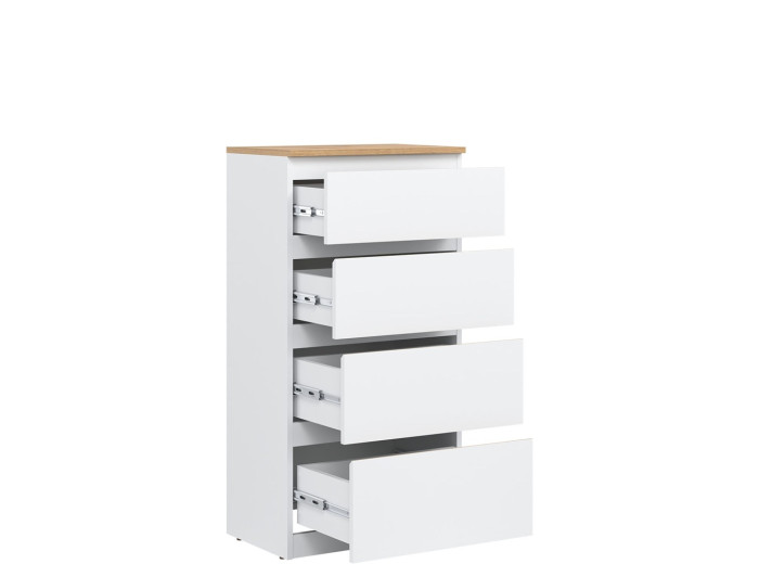 Vyrobená je z laminovanej drevotriesky v hrúbke 16 mm s ABS hranami. Farebné prevedenie je biela + dub evoke. Tradičné úchytky boli nahradené frézovanými hranami vo farbe dub evoke. Úložný priestor tvoria štyri zásuvky, vhodné na uloženie dokumentov, drobností, textílií či osobných vecí. Komoda sa osvedčí aj v detských izbách, kde poslúži na oblečenie alebo školské potreby.