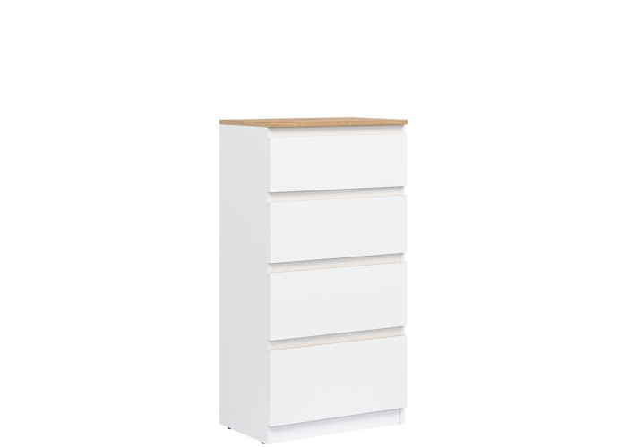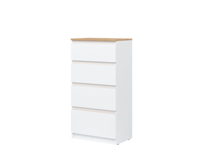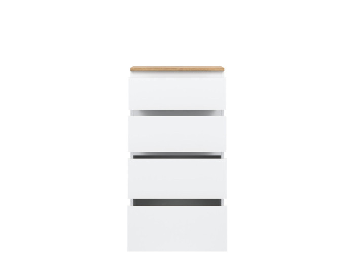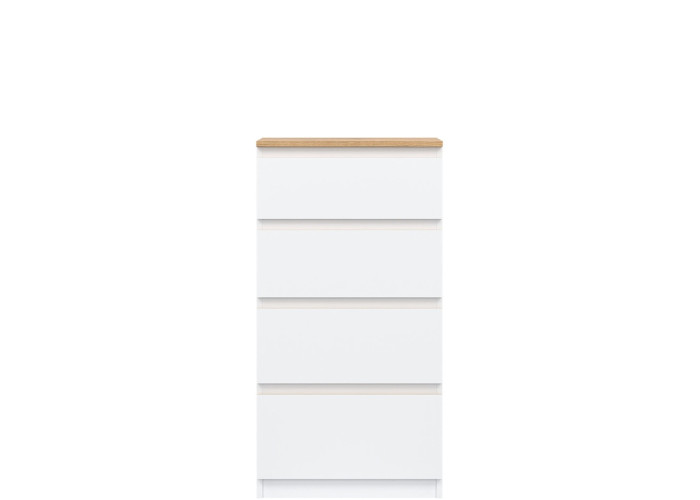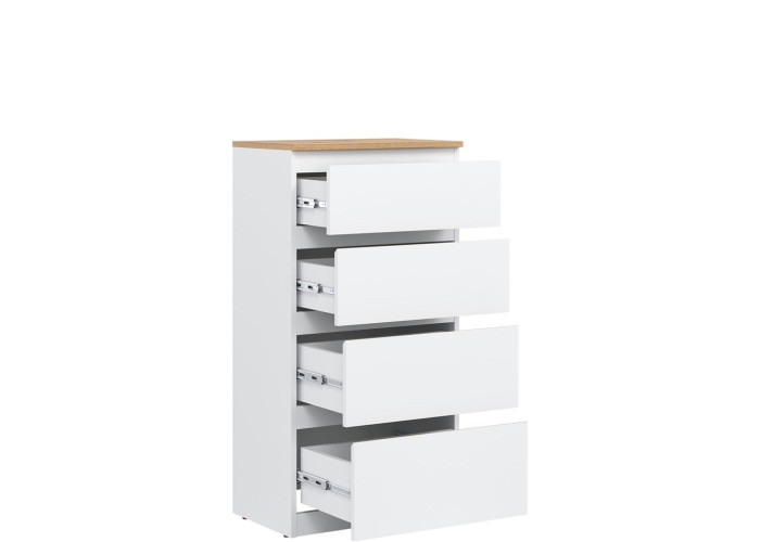 Vyrobená je z laminovanej drevotriesky v hrúbke 16 mm s ABS hranami. Farebné prevedenie je biela + dub evoke. Tradičné úchytky boli nahradené frézovanými hranami vo farbe dub evoke. Úložný priestor tvoria štyri zásuvky, vhodné na uloženie dokumentov, drobností, textílií či osobných vecí. Komoda sa osvedčí aj v detských izbách, kde poslúži na oblečenie alebo školské potreby.