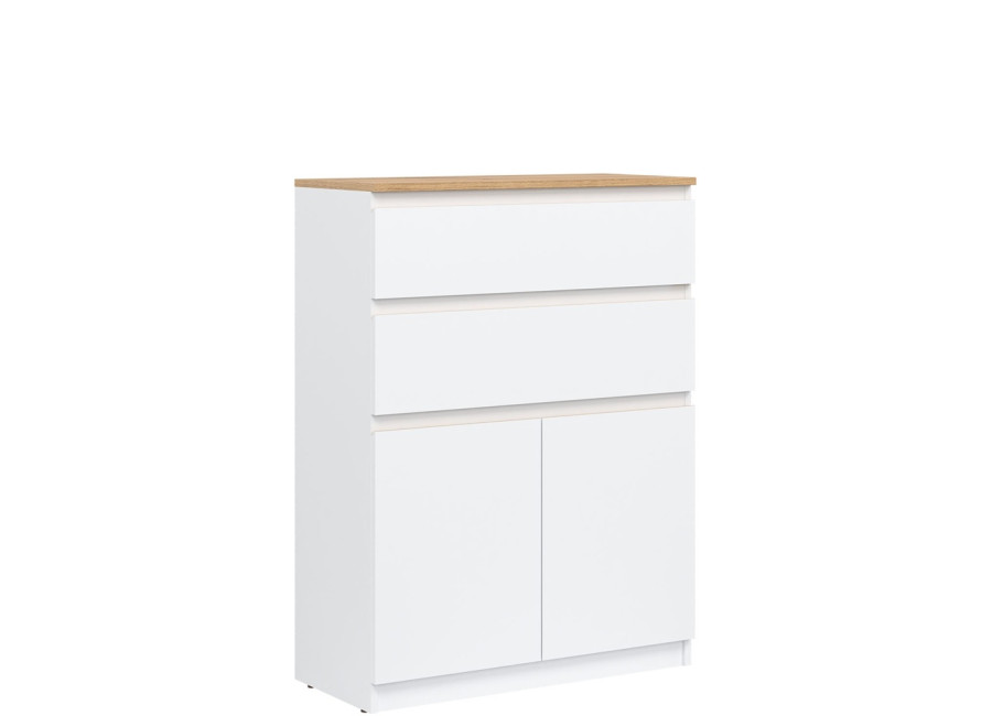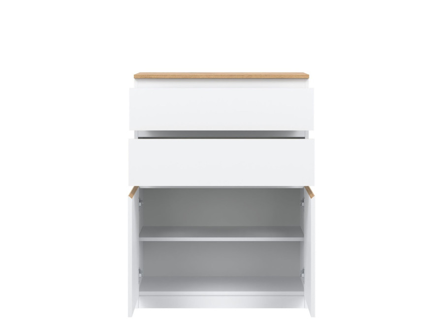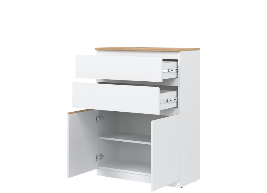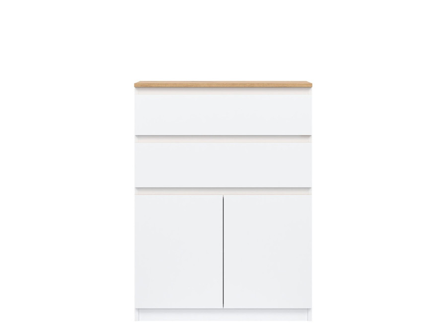 Vyrobená je z laminovanej drevotriesky v hrúbke 16 mm s ABS hranami. Farebné prevedenie je biela + dub evoke. Tradičné úchytky boli nahradené frézovanými hranami vo farbe dub evoke. Úložný priestor tvoria dve zásuvky a dvoje dvierok, ktoré poskytujú miesto na uloženie dokumentov, textílií alebo drobných predmetov. Komoda je vhodná aj do detských izieb, kde poslúži na oblečenie či školské potreby.