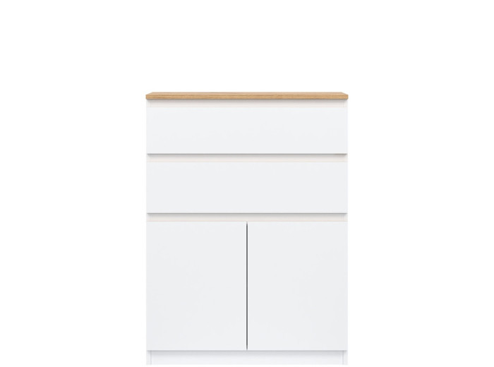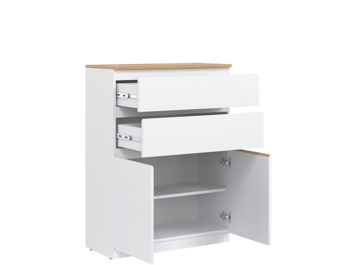 Vyrobená je z laminovanej drevotriesky v hrúbke 16 mm s ABS hranami. Farebné prevedenie je biela + dub evoke. Tradičné úchytky boli nahradené frézovanými hranami vo farbe dub evoke. Úložný priestor tvoria dve zásuvky a dvoje dvierok, ktoré poskytujú miesto na uloženie dokumentov, textílií alebo drobných predmetov. Komoda je vhodná aj do detských izieb, kde poslúži na oblečenie či školské potreby.