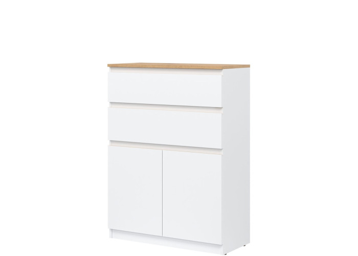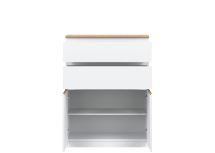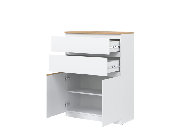Vyrobená je z laminovanej drevotriesky v hrúbke 16 mm s ABS hranami. Farebné prevedenie je biela + dub evoke. Tradičné úchytky boli nahradené frézovanými hranami vo farbe dub evoke. Úložný priestor tvoria dve zásuvky a dvoje dvierok, ktoré poskytujú miesto na uloženie dokumentov, textílií alebo drobných predmetov. Komoda je vhodná aj do detských izieb, kde poslúži na oblečenie či školské potreby.