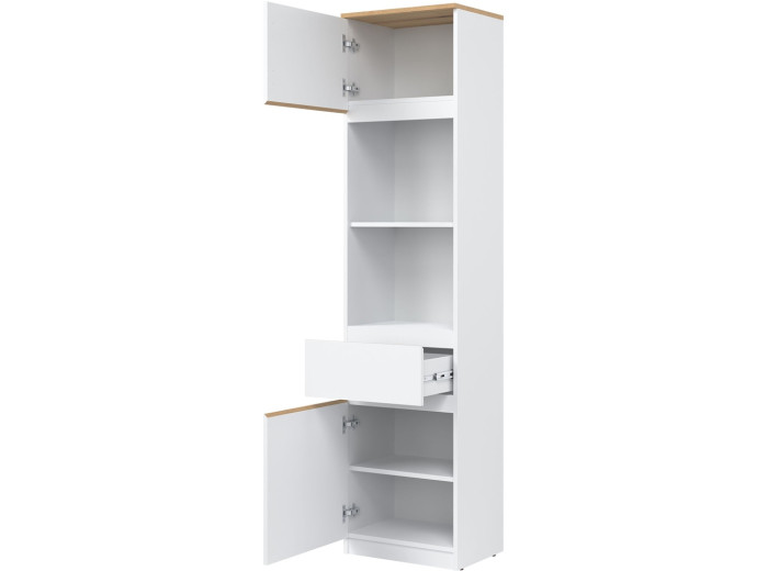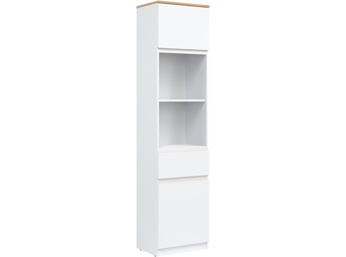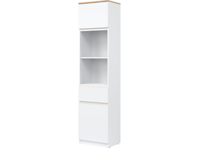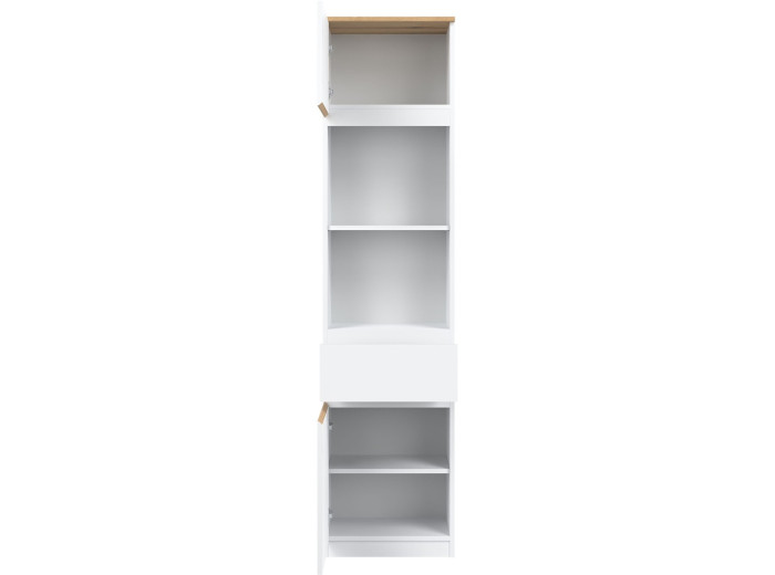 Policová skriňa REMI RM08 predstavuje praktický úložný prvok, ktorý sa uplatní v rôznych typoch interiérov. Ide o policovú skriňu resp. regál v šírke 47,5 cm, vďaka čomu je vhodná aj do menších miestností. Vyrobená je z laminovanej drevotriesky v hrúbke 16 mm s ABS hranami. Farebné prevedenie je biela + dub evoke. Tradičné úchytky boli nahradené frézovanými prednými časťami. Výhodou je aj možnosť, že skrinku môžete zmontovať na ľavé alebo pravé otváranie dvierok podľa dispozície priestoru.