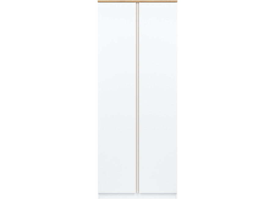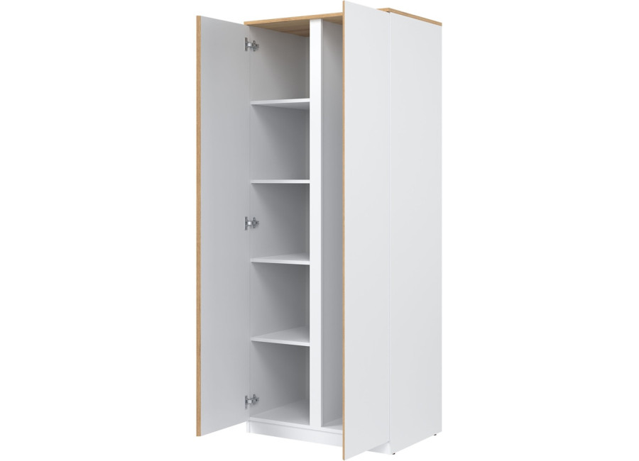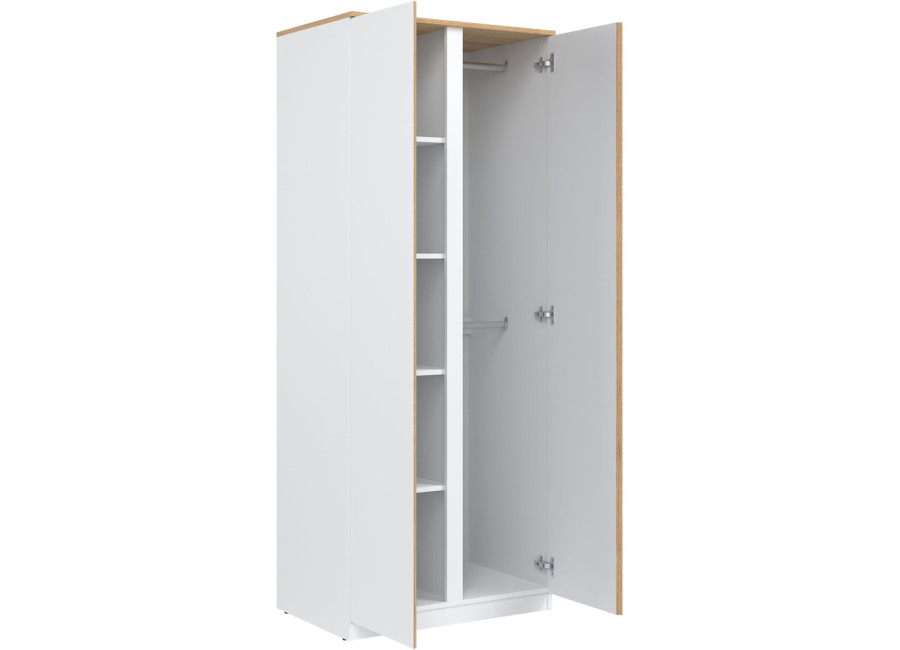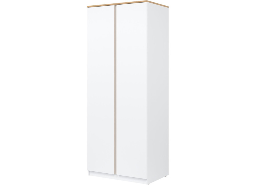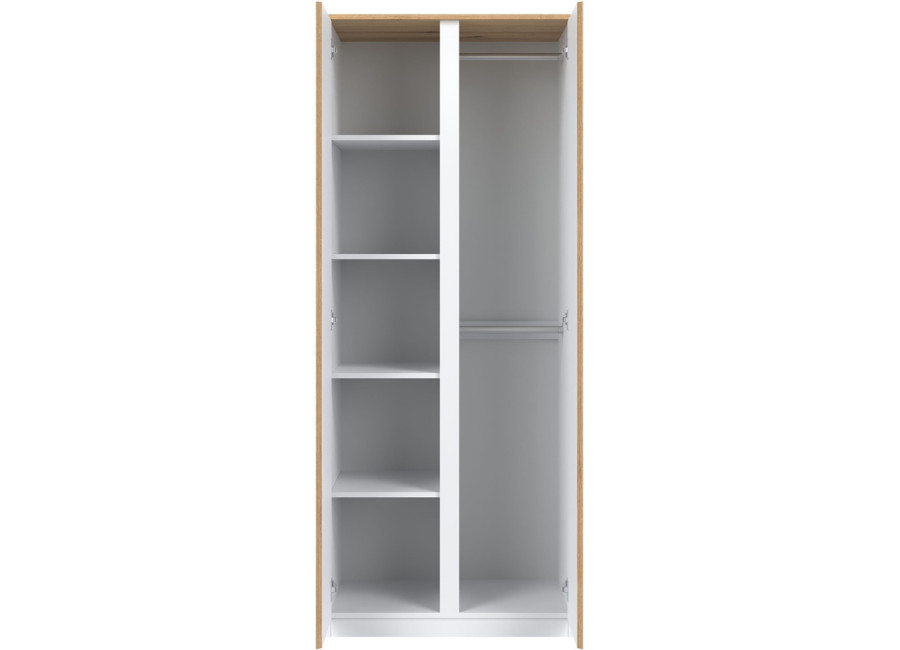 Šatníkovo-policová skriňa REMI RM10 v šírke 78 cm je vhodná aj do menších miestností alebo ako doplnok k väčšej zostave. Vyrobená je z laminovanej drevotriesky v hrúbke 16 mm s ABS hranami. Farebné prevedenie je biela + dub evoke. Má dvoje dvierka, pričom tradičné úchytky boli nahradené frézovanými hranami vo farbe dub. Vnútorné usporiadanie umožňuje zavesiť oblečenie na vešiakovú tyč, druhá polovica skrine je policová. Skriňa sa osvedčí nielen v obývačke, ale aj v detských izbách, kde poskytne praktický priestor na oblečenie, školské potreby či hračky.
