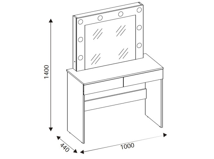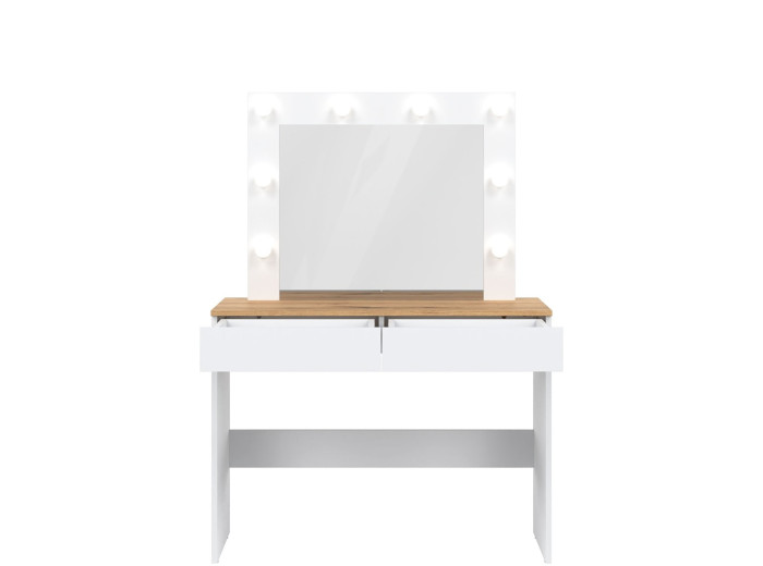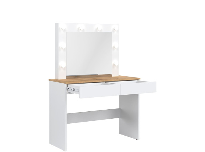 Úložný priestor tvoria dve zásuvky, vhodné na uloženie kozmetiky, šperkov, vlasových doplnkov alebo osobných drobností. Kozmetický stolík so zrkadlom a osvetlením je ideálny na líčenie aj každodenné úpravy. Vďaka svojej funkčnosti a dizajnu sa stane prirodzenou súčasťou každodenného režimu.