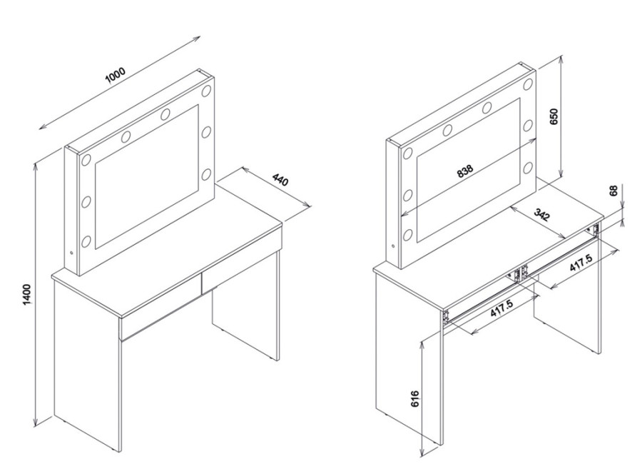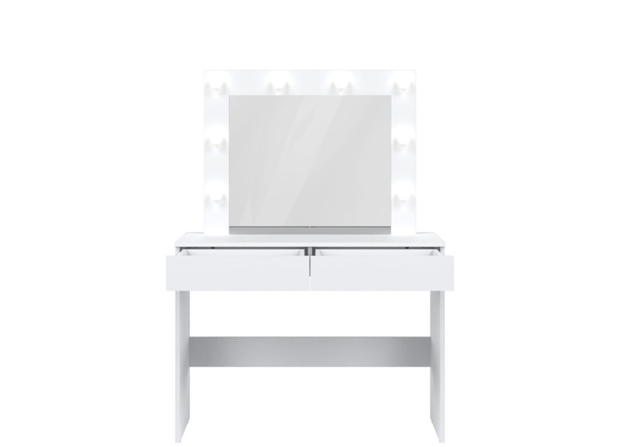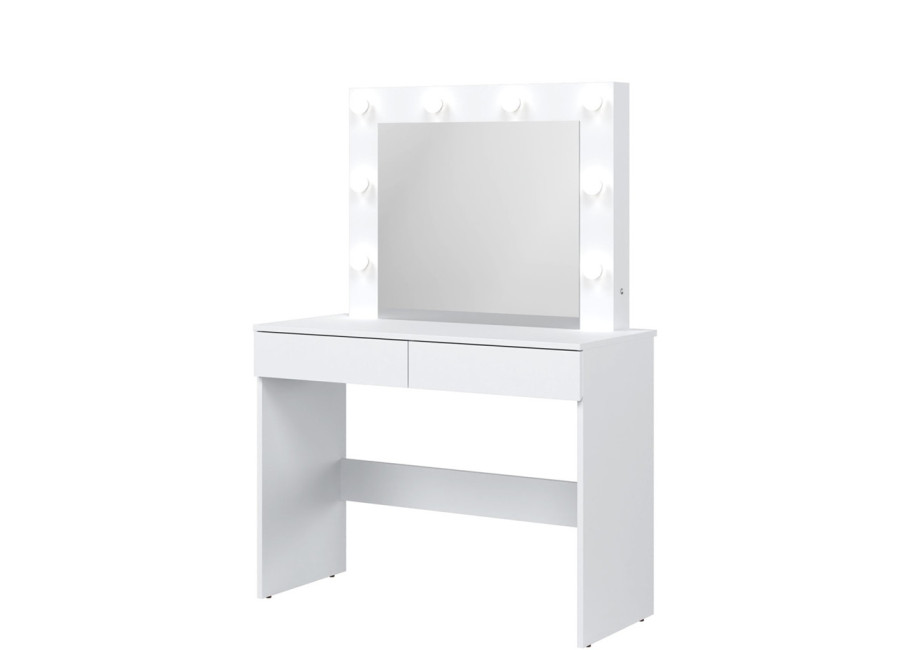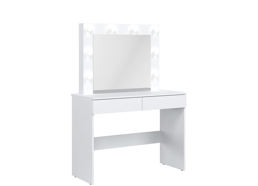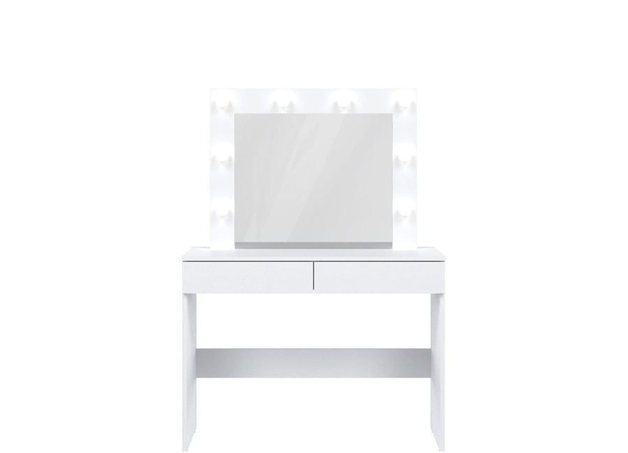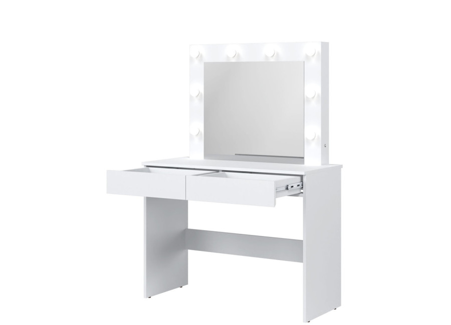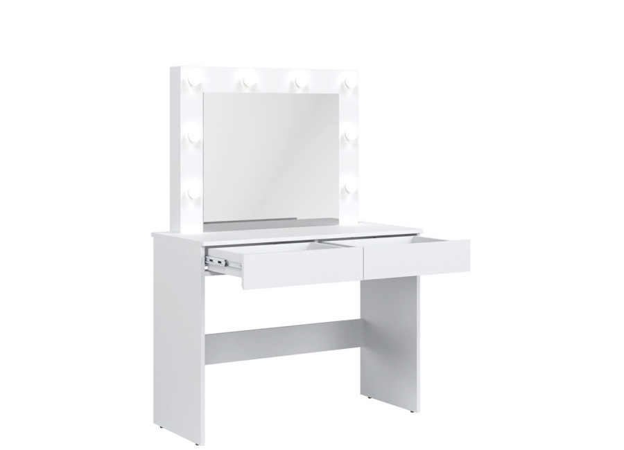 Úložný priestor tvoria dve zásuvky, vhodné na uloženie kozmetiky, šperkov, vlasových doplnkov alebo osobných drobností. Kozmetický stolík so zrkadlom a osvetlením je ideálny na líčenie aj každodenné úpravy. Vďaka svojej funkčnosti a dizajnu sa stane prirodzenou súčasťou každodenného režimu.