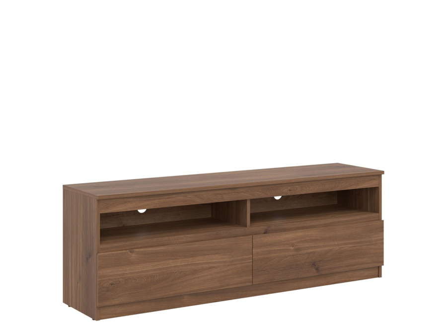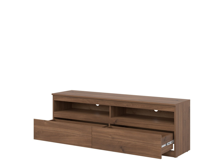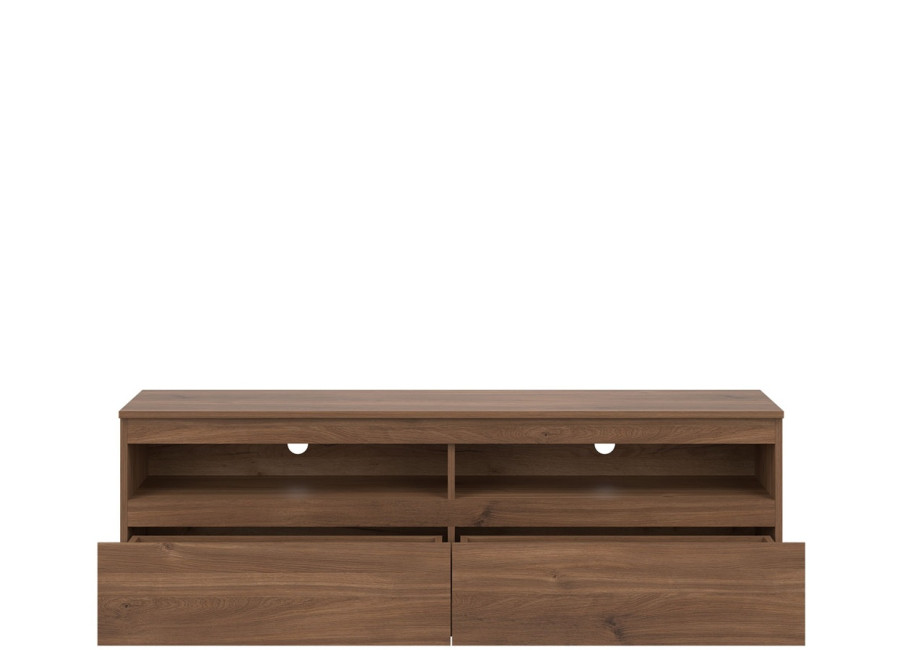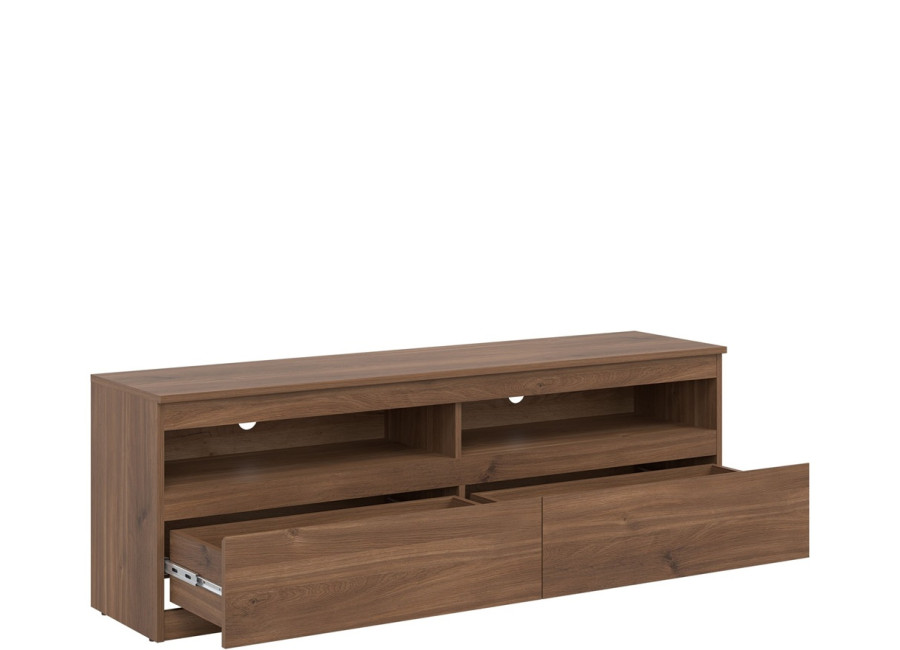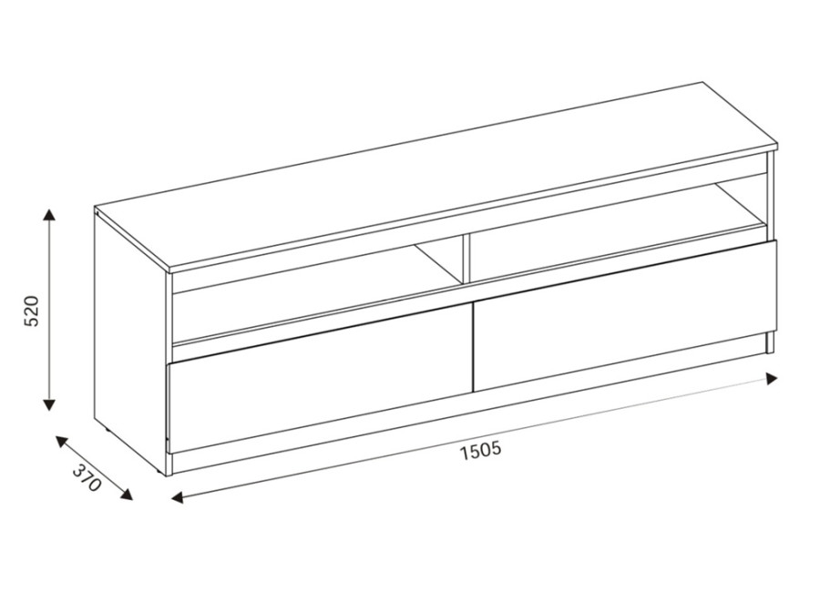 Z praktického hľadiska ponúka skrinka dobre rozdelený úložný priestor. Dve zásuvky a dve otvorené police umožňujú prehľadné uloženie ovládačov, dokumentov, káblov, herných konzol či prehrávačov.