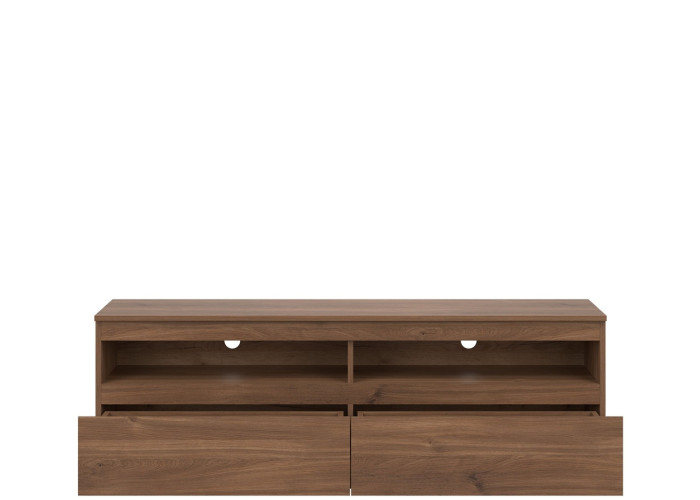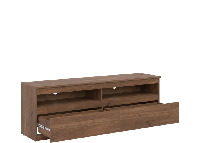 Z praktického hľadiska ponúka skrinka dobre rozdelený úložný priestor. Dve zásuvky a dve otvorené police umožňujú prehľadné uloženie ovládačov, dokumentov, káblov, herných konzol či prehrávačov.