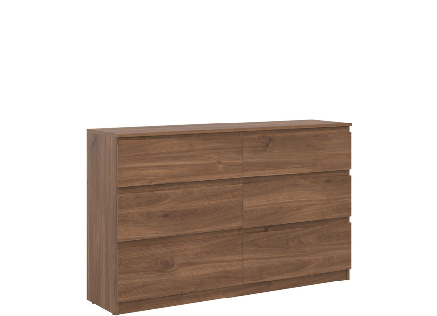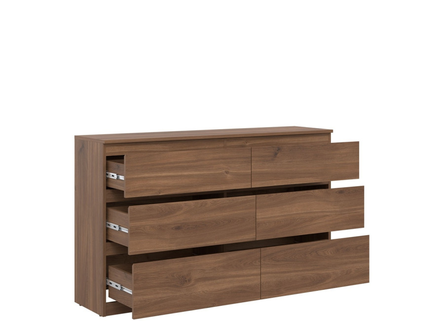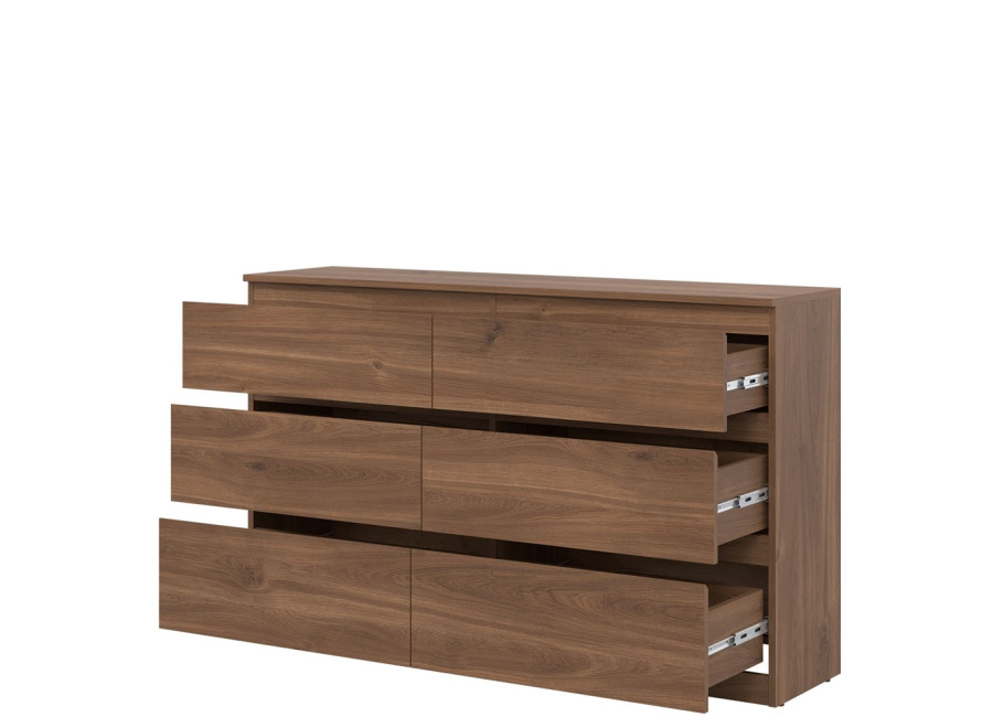 Komoda je vyrobená je z laminovanej drevotriesky v hrúbke 16 mm s ABS hranami. Farebné prevedenie je dub castello. Tradičné úchytky boli nahradené frézovanými hranami. Úložný priestor tvorí šesť zásuviek, ktoré umožňujú prehľadné rozdelenie uložených vecí. V obývačke môžu slúžiť na uskladnenie dokumentov, textílií alebo doplnkov. Komoda je vhodná aj do detskej izby, kde poskytne miesto na oblečenie či hračky.