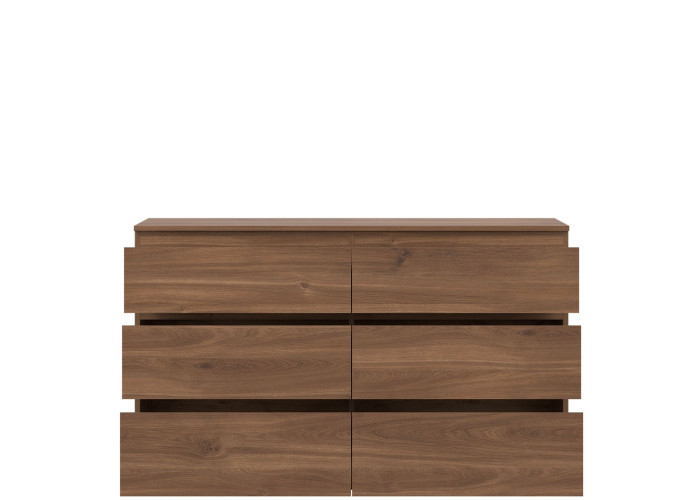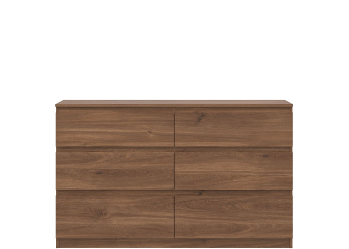 Komoda je vyrobená je z laminovanej drevotriesky v hrúbke 16 mm s ABS hranami. Farebné prevedenie je dub castello. Tradičné úchytky boli nahradené frézovanými hranami. Úložný priestor tvorí šesť zásuviek, ktoré umožňujú prehľadné rozdelenie uložených vecí. V obývačke môžu slúžiť na uskladnenie dokumentov, textílií alebo doplnkov. Komoda je vhodná aj do detskej izby, kde poskytne miesto na oblečenie či hračky.