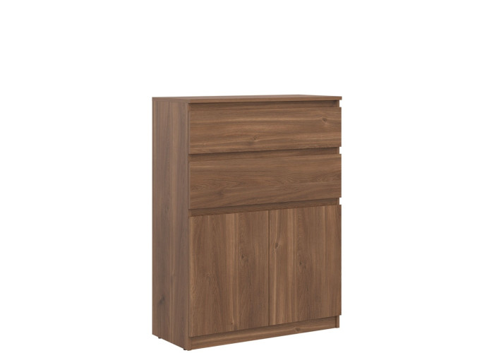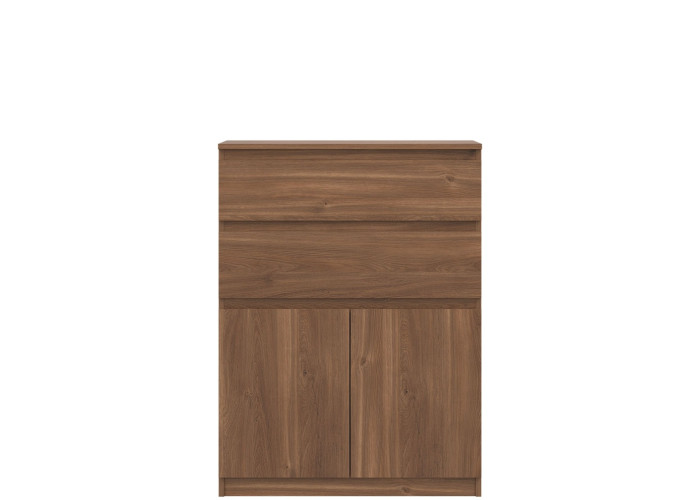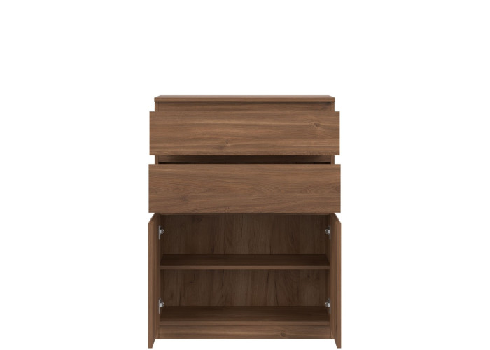 Vyrobená je z laminovanej drevotriesky v hrúbke 16 mm s ABS hranami. Farebné prevedenie je dub castello. Tradičné úchytky boli nahradené frézovanými hranami. Úložný priestor tvoria dve zásuvky a dvoje dvierok, ktoré poskytujú miesto na uloženie dokumentov, textílií alebo drobných predmetov. Komoda je vhodná aj do detských izieb, kde poslúži na oblečenie či školské potreby.