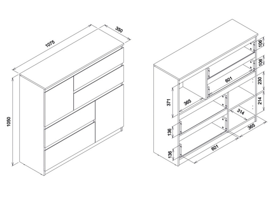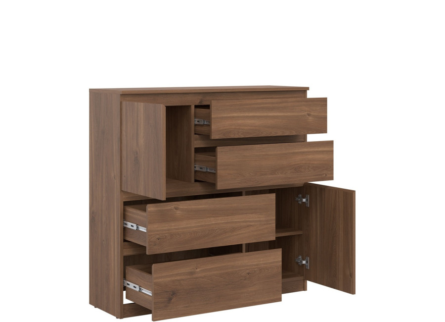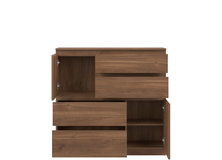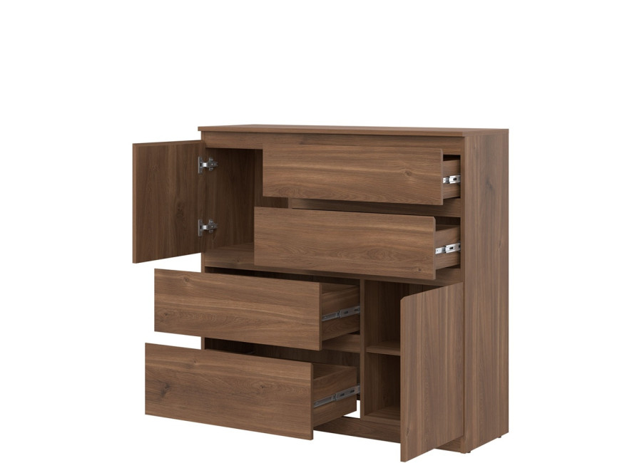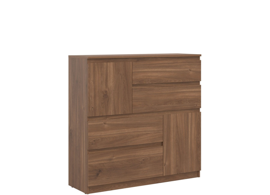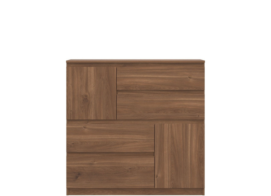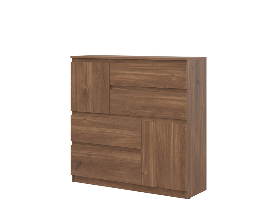 Komoda REMI RM06 má šírku 107,5 cm. Minimalistický a jednoduchý dizajn umožňuje jej ľahké začlenenie do rôznych typov interiérov. Komoda je vyrobená je z laminovanej drevotriesky v hrúbke 16 mm s ABS hranami. Farebné prevedenie je dub castello. Tradičné úchytky boli nahradené frézovanými hranami. Úložný priestor tvoria štyri zásuvky a dvoje dvierok, vhodné na uloženie dokumentov, textílií, drobností či domácich doplnkov. Komoda sa uplatní v obývačke ako súčasť obývacej steny, ale aj v detských izbách, kde poslúži na oblečenie alebo hračky.