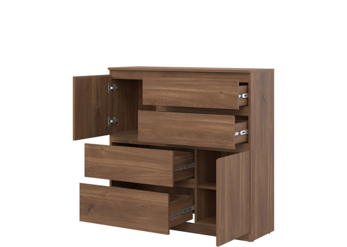 Komoda REMI RM06 má šírku 107,5 cm. Minimalistický a jednoduchý dizajn umožňuje jej ľahké začlenenie do rôznych typov interiérov. Komoda je vyrobená je z laminovanej drevotriesky v hrúbke 16 mm s ABS hranami. Farebné prevedenie je dub castello. Tradičné úchytky boli nahradené frézovanými hranami. Úložný priestor tvoria štyri zásuvky a dvoje dvierok, vhodné na uloženie dokumentov, textílií, drobností či domácich doplnkov. Komoda sa uplatní v obývačke ako súčasť obývacej steny, ale aj v detských izbách, kde poslúži na oblečenie alebo hračky.