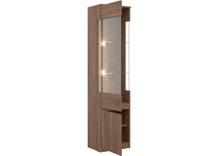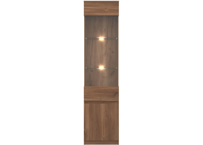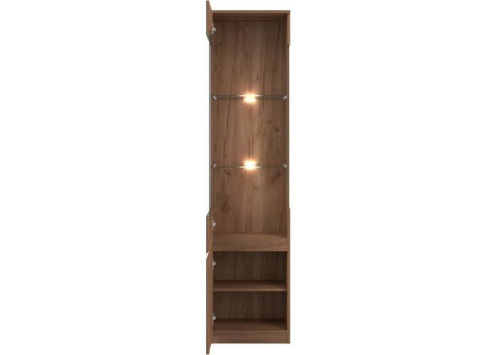 Vitrína REMI RM07 je praktickým doplnkom do moderného aj klasického interiéru. Ide o vitrínu v šírke 47,5 cm, ktorá sa vďaka kompaktným rozmerom hodí aj do menších miestností. Je súčasťou sektorového nábytku REMI, takže ju možno jednoducho zladiť s ďalšími prvkami do ucelenej zostavy. Vyrobená je z laminovanej drevotriesky v hrúbke 16 mm s ABS hranami. Farebné prevedenie je dub castello. Vitrína má dvoje dvierka (univerzálne), vrchné sú presklené. Využitie nájde v obývačke ako súčasť obývacej steny, ale aj v detských izbách na knihy, hry či trofeje.