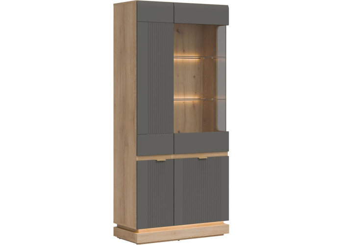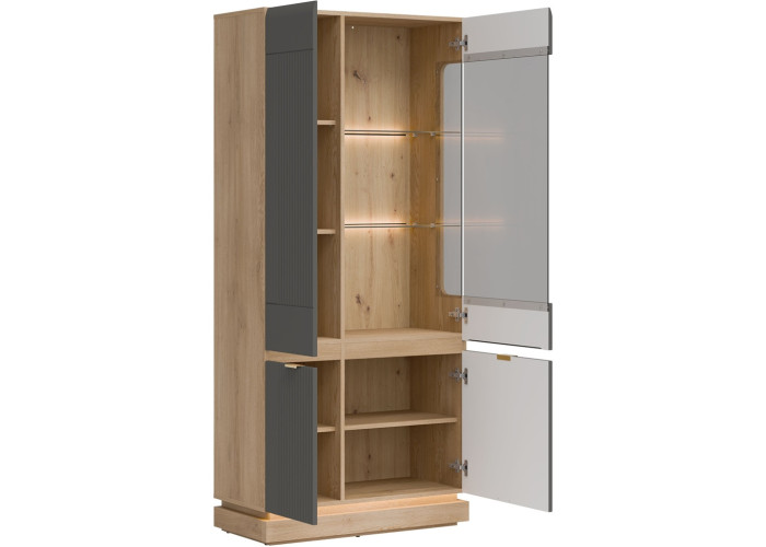 Vysoká vitrína MILTON ML06 je štýlovým a zároveň praktickým riešením pre každú obývačku. Ponúka dostatok úložného priestoru, vďaka ktorému budete mať všetko prehľadne usporiadané a vždy po ruke. Presklená horná časť elegantne zvýrazní Vaše obľúbené dekorácie, rodinné fotografie či dizajnové kúsky a dodá interiéru osobitý charakter.