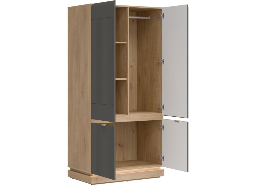 Šatníková skriňa MILTON ML08 je praktický a zároveň elegantný kúsok nábytku, ktorý sa prirodzene hodí do obývačky, spálne aj predsiene. So šírkou 95 cm poskytuje dostatok priestoru na oblečenie, kabáty, sezónne kúsky aj rôzne domáce doplnky, ktoré chcete mať vždy poruke. Štyri dvierka ukrývajú prehľadne riešený vnútorný priestor, vďaka ktorému si jednoducho zorganizujete všetko potrebné a udržíte domácnosť upratanú.