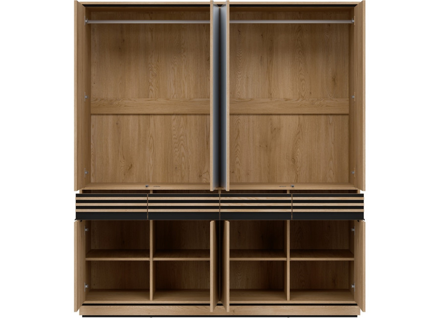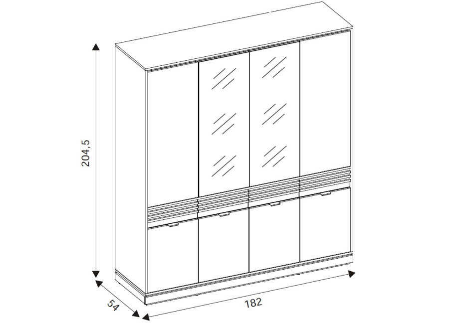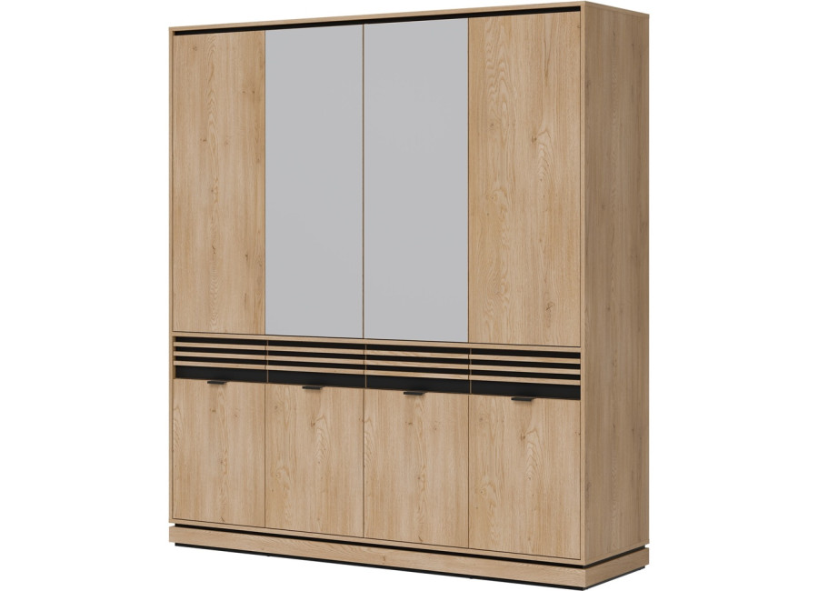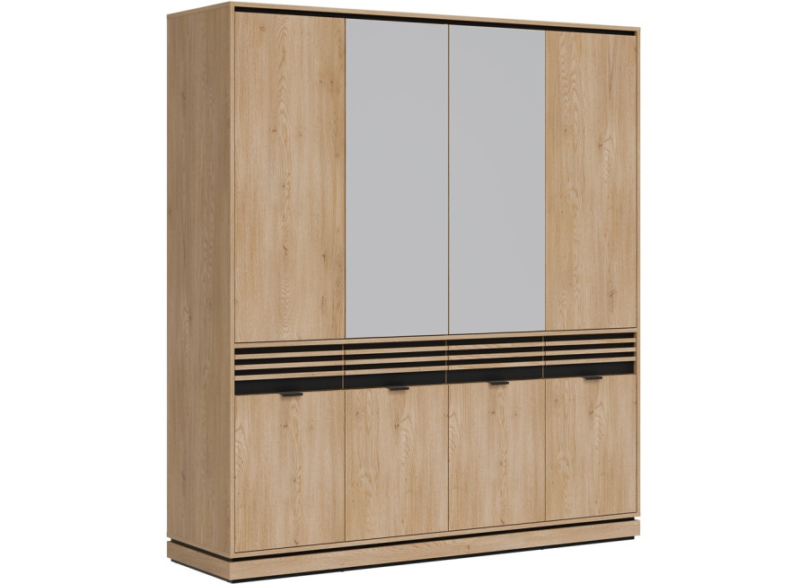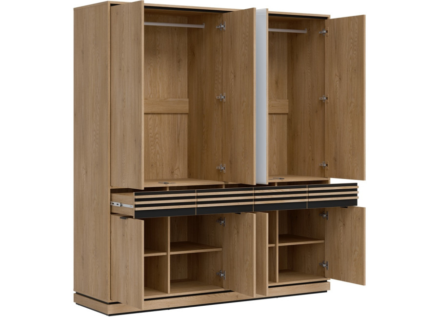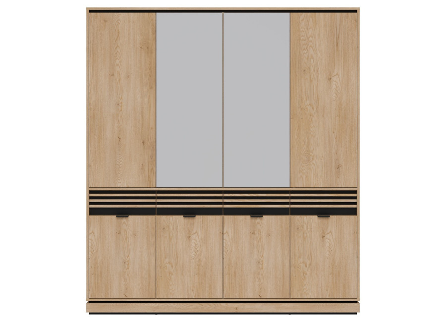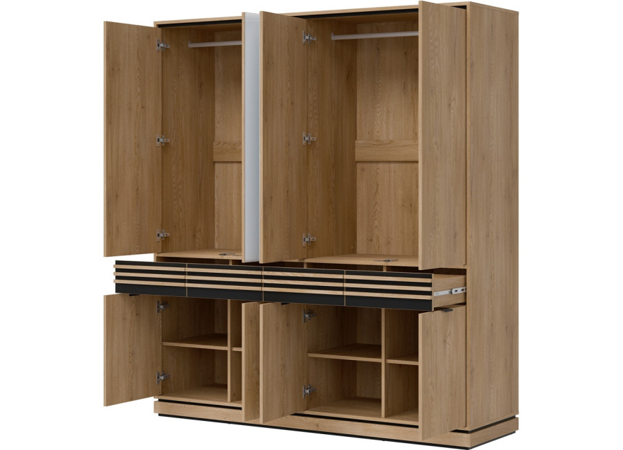 Šatníková skriňa FERRO FE11 predstavuje vkusnú kombináciu dizajnu a funkčnosti, ktorá nájde uplatnenie v spálni, predsieni aj obývacej izbe. Pri šírke 182 cm ponúka táto skriňa bohatú kapacitu pre váš kompletný šatník, sezónne oblečenie či iné domáce potreby. Vnútorné usporiadanie je šikovne rozdelené na policovú a vešiakovú časť, čo zaručuje maximálny prehľad. Praktickou vychytávkou sú horné dvierka so systémom „Push to Open“ a stredové zrkadlá, ktoré opticky zväčšujú miestnosť a uľahčujú každodennú úpravu zovňajšku.